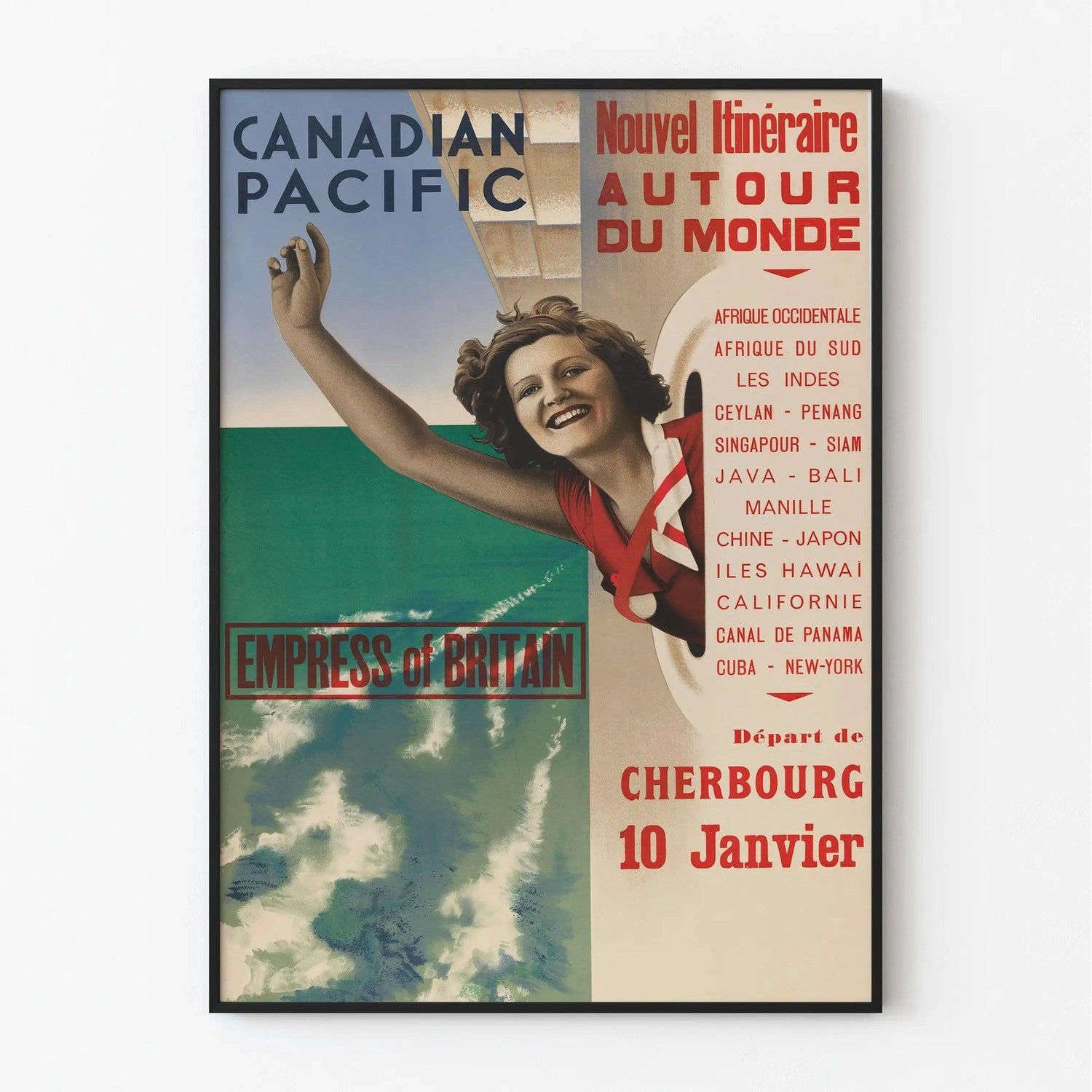 Laissez-vous emporter par le charme de cette affiche Canadian Pacific vintage illustrant une croisière de rêve à bord du mythique paquebot Empress of Britain. Avec ses couleurs éclatantes et son design typique des années 1930-60, cette affiche publicitaire évoque l’élégance du voyage transocéanique à l’époque des grands liners.