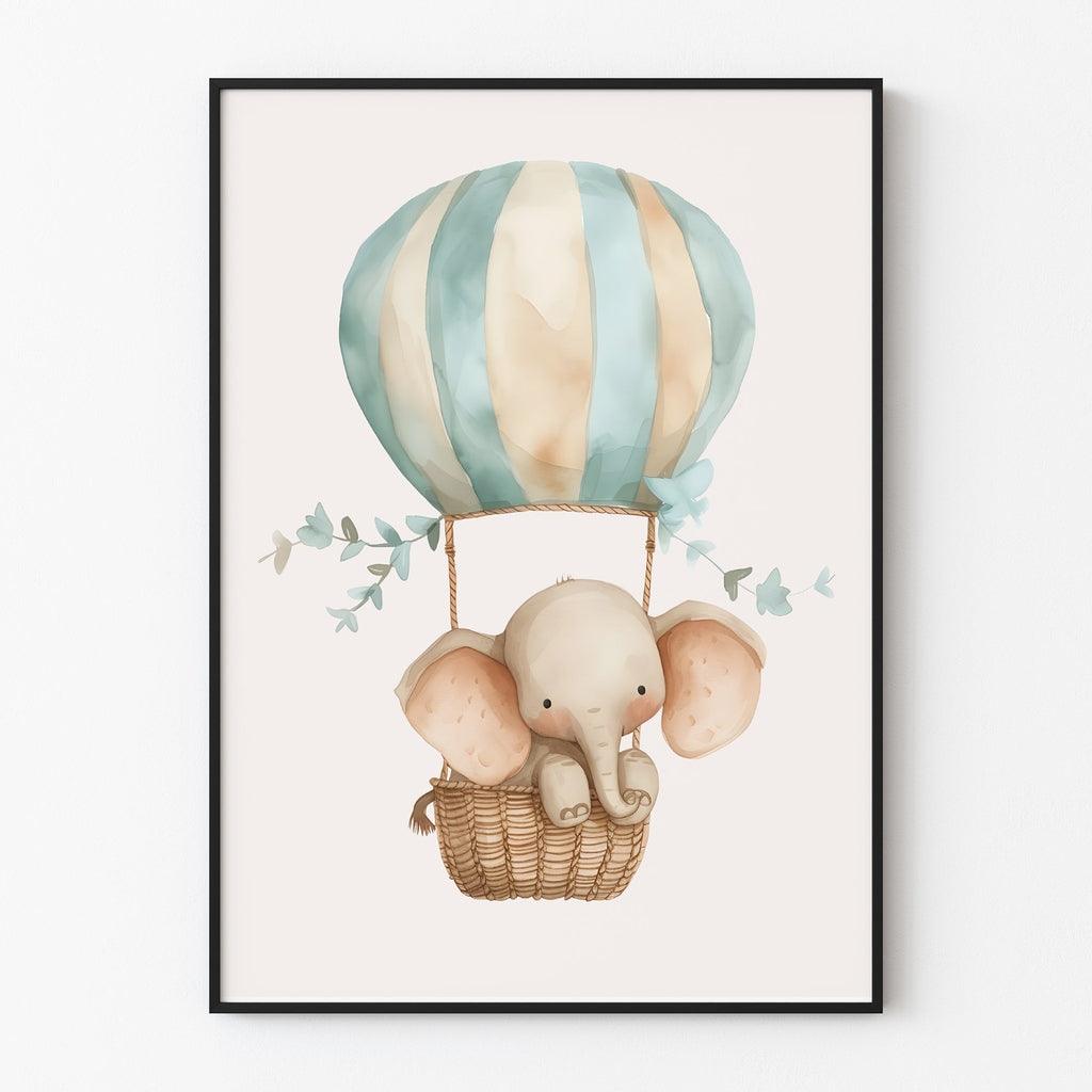 Affiche Décoration Chambre Bébé - "Éléphant en Montgolfière Aventureuse"