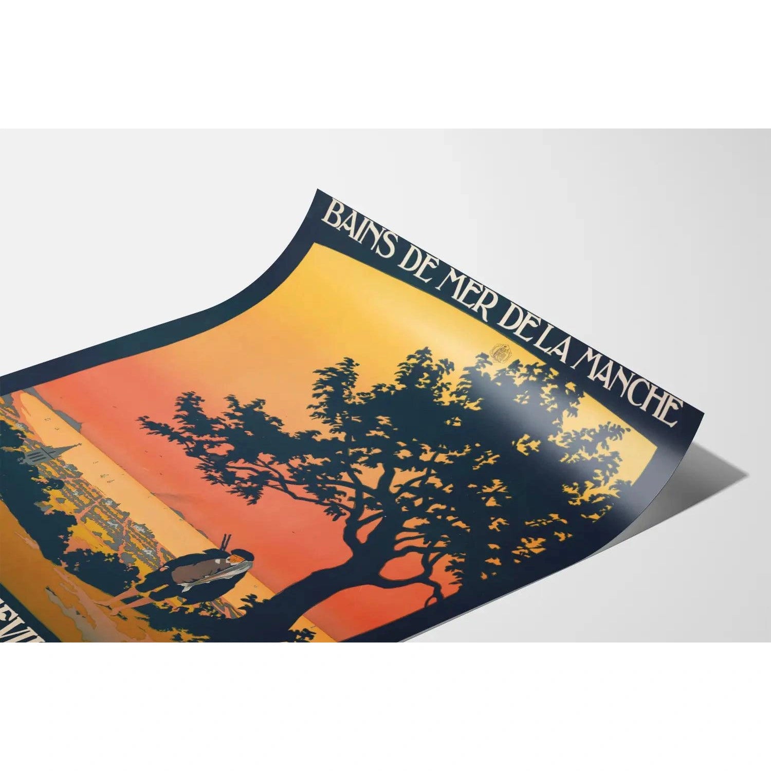 Admirez la côte normande au coucher du soleil avec cette affiche Hauteville-sur-Mer vintage, une invitation poétique à la détente et à la découverte.