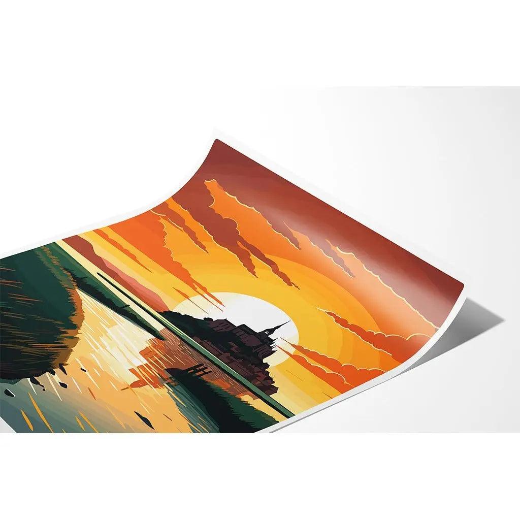 Plongez dans la sérénité avec notre affiche artistique du Mont Saint-Michel, un véritable bijou du patrimoine français. Cette œuvre captivante, imprégnée des couleurs vibrantes d'un coucher ou lever de soleil, évoque la beauté intemporelle de ce lieu mythique. Chaque détail est stylisé pour sublimer les traits emblématiques de l'abbaye, se découpant fièrement sur un fond aux teintes chaleureuses de jaune, d'orange et de rouge.