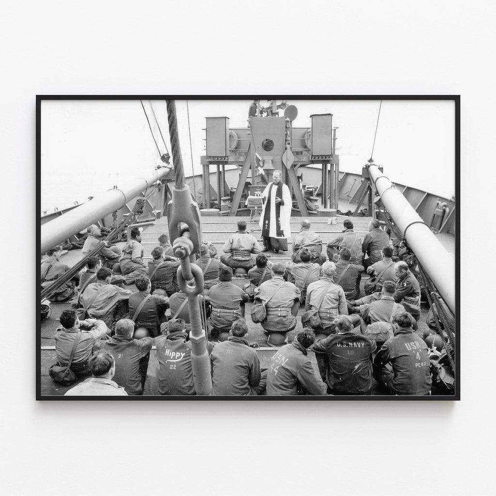 Cette photographie saisissante capture un moment spirituel et solennel durant les opérations du Débarquement en Normandie. Des soldats américains (GI's) et des marins de l'US Navy, reconnaissables à leurs blousons, assistent au prêche d’un aumônier militaire à bord d’un transport de troupes. L’aumônier a installé un autel portatif derrière lui, symbolisant la foi et le réconfort au milieu des combats.
