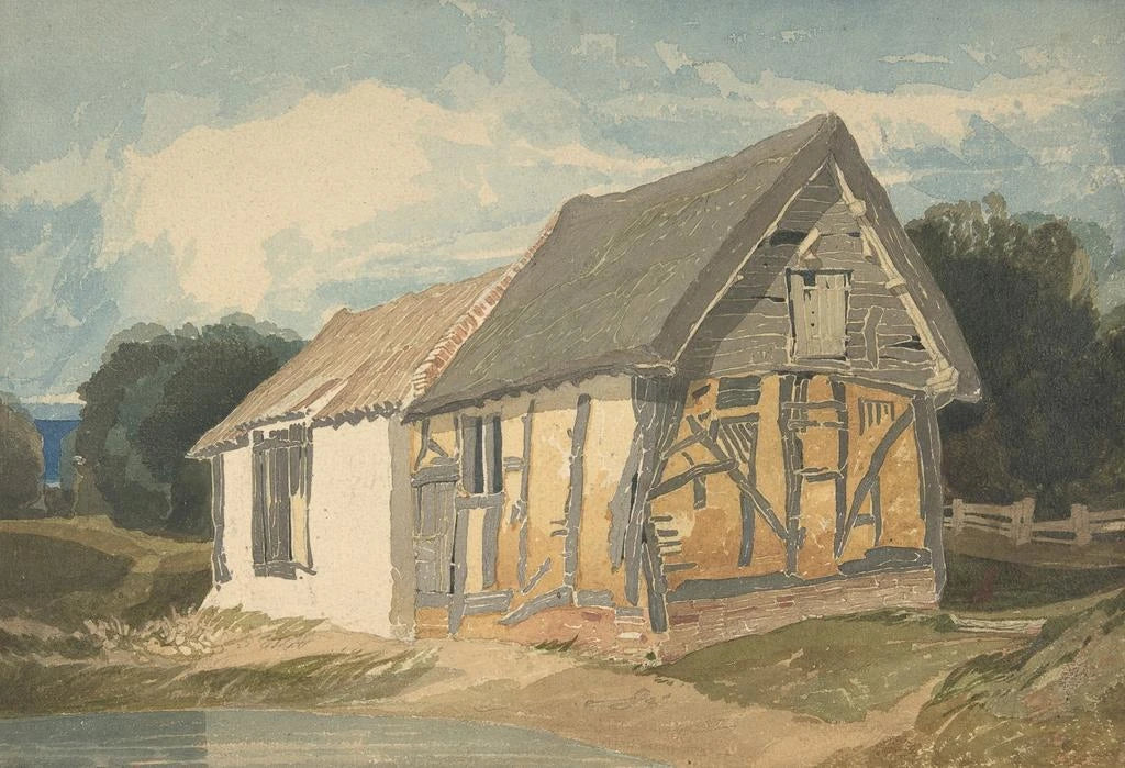 Cette œuvre de John Sell Cotman, intitulée "Bâtiment de ferme près d'un étang", évoque une sérénité bucolique où l'architecture se fond délicatement dans le paysage. Les couleurs douces et pastel, typiques de l'aquarelle, créent une atmosphère apaisante, tandis que les reflets de l'étang ajoutent une dimension poétique à la scène. Cotman, maître de la lumière, joue avec les nuances pour donner vie à cette ferme, où chaque détail, du toit aux arbres environnants, semble respirer la tranquillité. L'œuvre invite à une contemplation silencieuse, un moment suspendu entre ciel et terre.