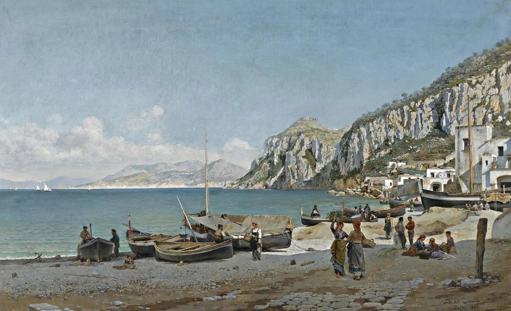 Federico del Campo, peintre du XIXe siècle, est reconnu pour ses paysages marins et ses vues de la nature, notamment celles d'Italie. Influencé par le mouvement romantique, il a su capturer la beauté des paysages avec une sensibilité unique. Ses œuvres, souvent empreintes d'une atmosphère poétique, témoignent de son amour pour la nature et des voyages qu'il a entrepris. "Capri" est un exemple emblématique de son style, où la lumière et la couleur se mêlent pour créer des compositions à la fois réalistes et idéalisées, célébrant la beauté du monde naturel.
