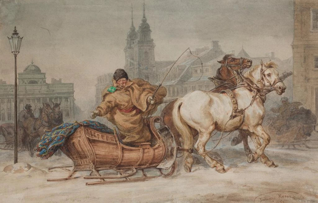 Le tableau "Cocher de Varsovie" de Juliusz Kossak dépeint une scène vivante de la vie citadine, où un cocher, fier et déterminé, conduit son attelage à travers les rues animées de Varsovie. Les couleurs chaudes et dynamiques, mêlées à des détails minutieux, créent une atmosphère vibrante et pleine de mouvement. Kossak, avec son style distinctif, parvient à capturer l'énergie de la ville tout en mettant en avant la relation entre l'homme et son cheval, symbole de force et de liberté.