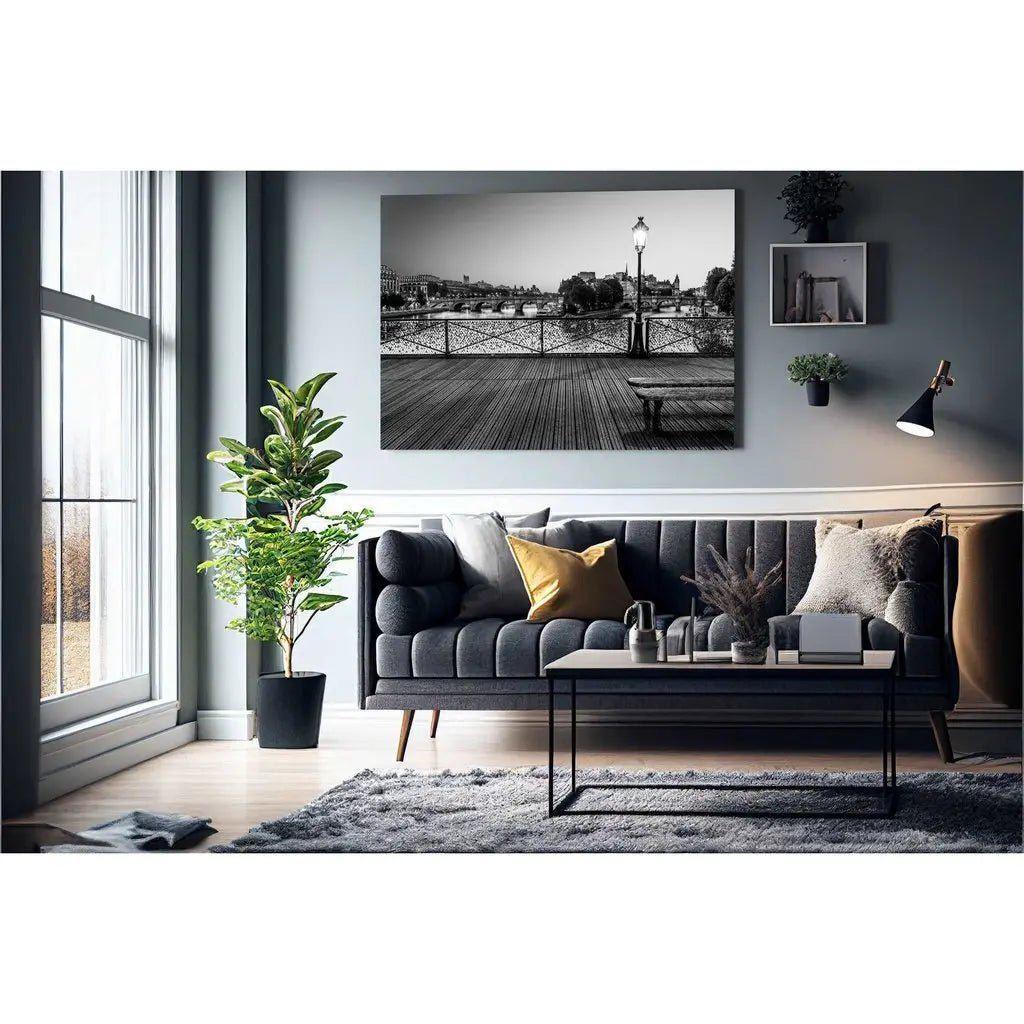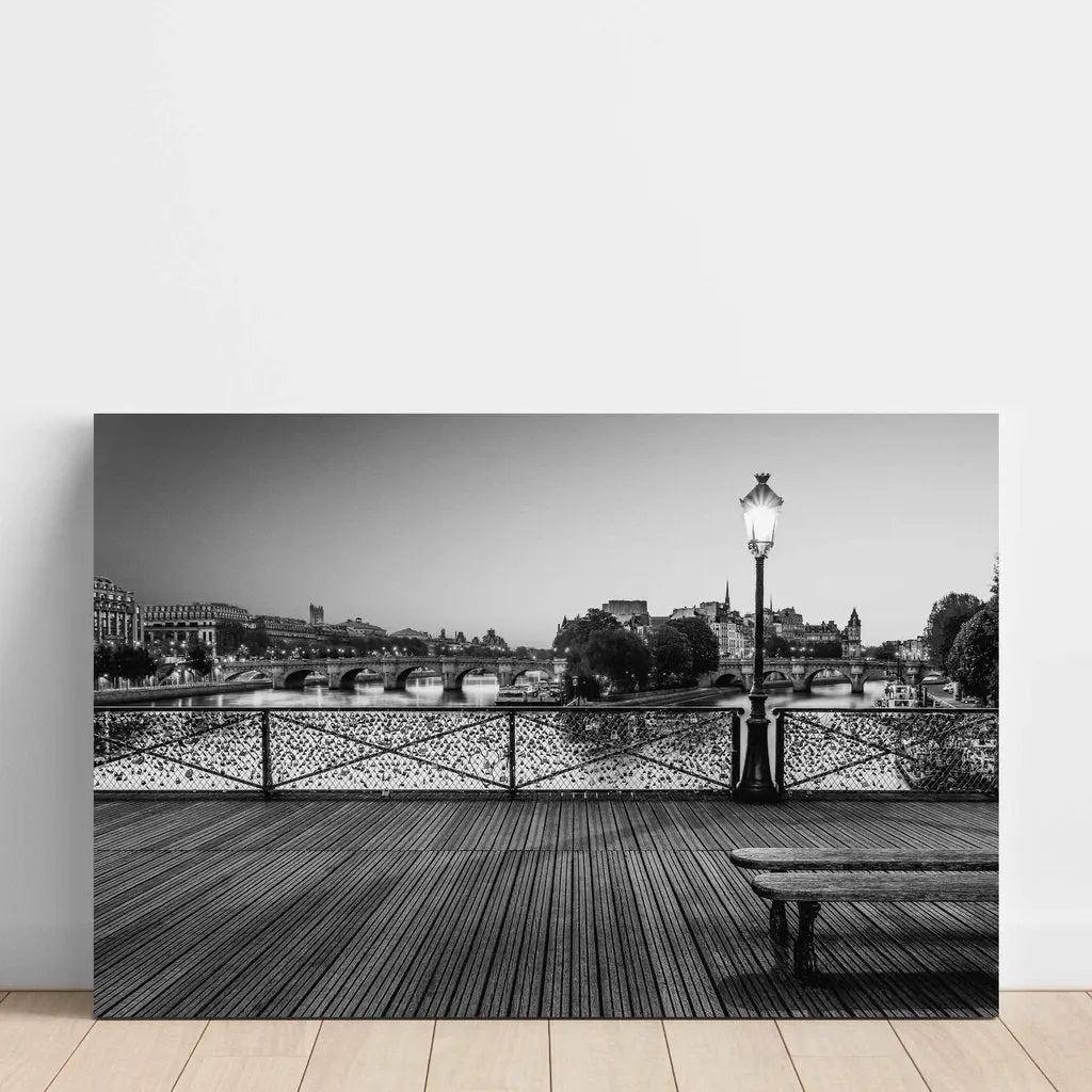Cette affiche de Paris en noir et blanc est plus qu'une simple décoration murale; c'est une fenêtre ouverte sur l'histoire et le charme intemporel de Paris. La photographie met en lumière les détails architecturaux du pont, capturant la texture du bois des planches, le fer forgé des balustrades, et la lueur subtile du réverbère. En arrière-plan, la silhouette des bâtiments historiques se dessine délicatement sous un ciel parisien légèrement voilé, créant une scène paisible et poétique. Cette composition en noir et blanc amplifie les contrastes, offrant une image à la fois dramatique et sobre, qui s'intégrera parfaitement dans n'importe quel intérieur.