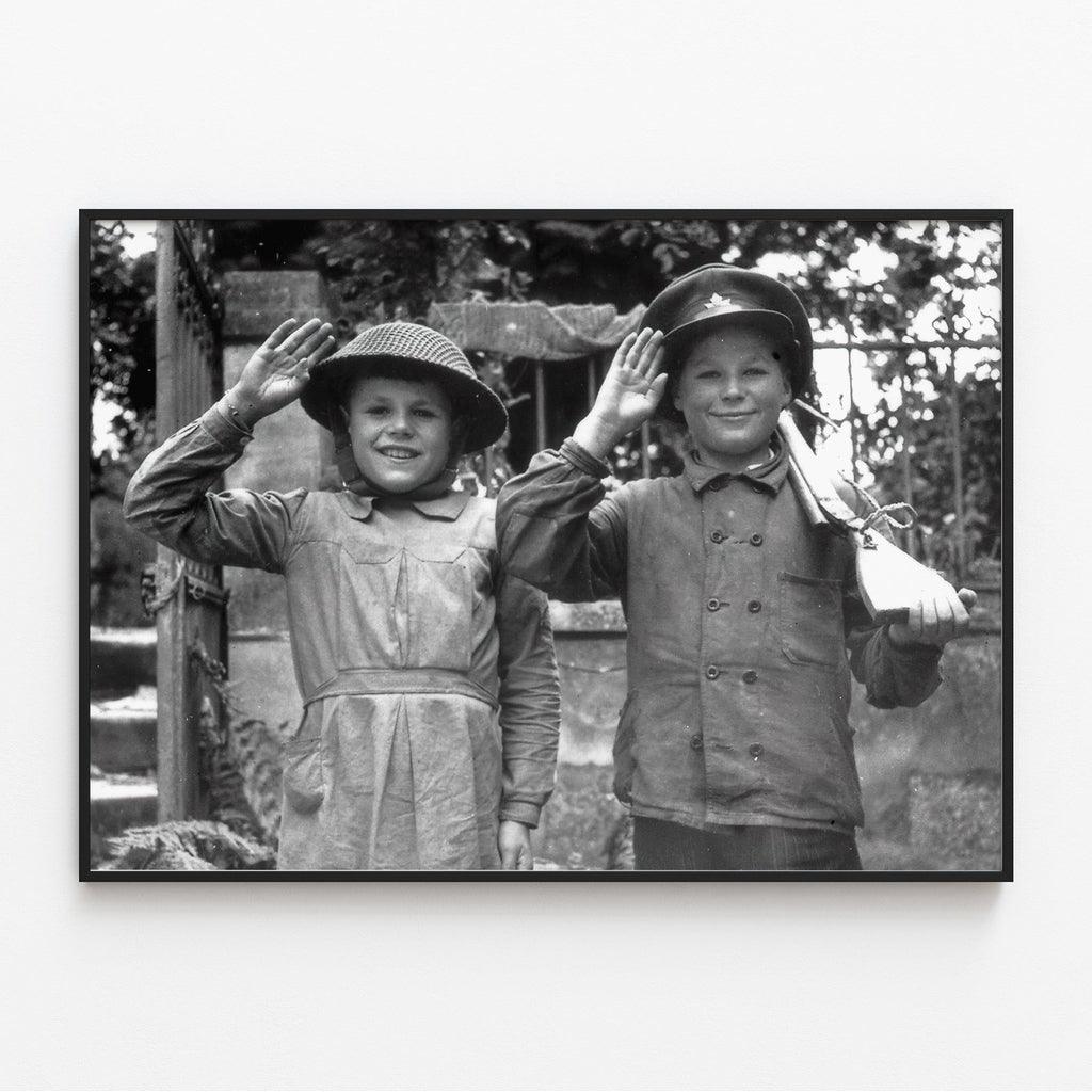 Cette photographie touchante prise par le photographe Ken Bell les 27 ou 28 juin 1944 capture deux jeunes frères, Guy et Michel Pierre, âgés de 10 et 13 ans, posant avec fierté dans un casque et une casquette canadiens. Leur sourire, accompagné de leur salut militaire, incarne l’esprit de résilience et l’admiration envers les forces alliées pendant la libération de la Normandie.