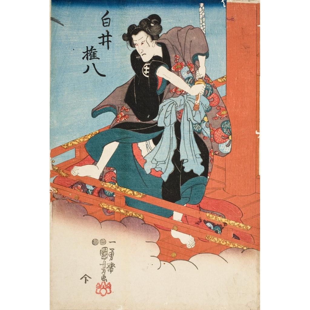 Dans cette composition captivante, le protagoniste, Iwai Hanshiro V, est dépeint avec une intensité dramatique, évoquant la bravoure et les luttes des samouraïs. La maîtrise technique de Kuniyoshi se manifeste à travers des lignes fluides et des détails minutieux, conférant à l'œuvre une profondeur émotionnelle qui résonne dans l'âme des spectateurs.