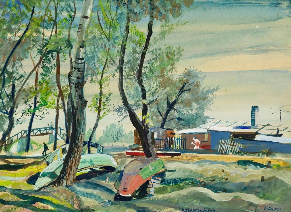 Kaisermühlen, œuvre emblématique d'Oskar Laske, nous plonge dans une atmosphère paisible où l'urbanité se mêle à la nature. La composition, riche en détails, nous présente un paysage urbain baigné de lumière douce, où les bâtiments se reflètent dans l'eau calme d'un canal. Les couleurs pastel, dominées par des nuances de bleu et de vert, créent une harmonie visuelle apaisante. La technique de Laske, mêlant impressionnisme et réalisme, permet de ressentir la tranquillité de cet endroit, invitant le spectateur à s'y perdre et à contempler la beauté du quotidien.