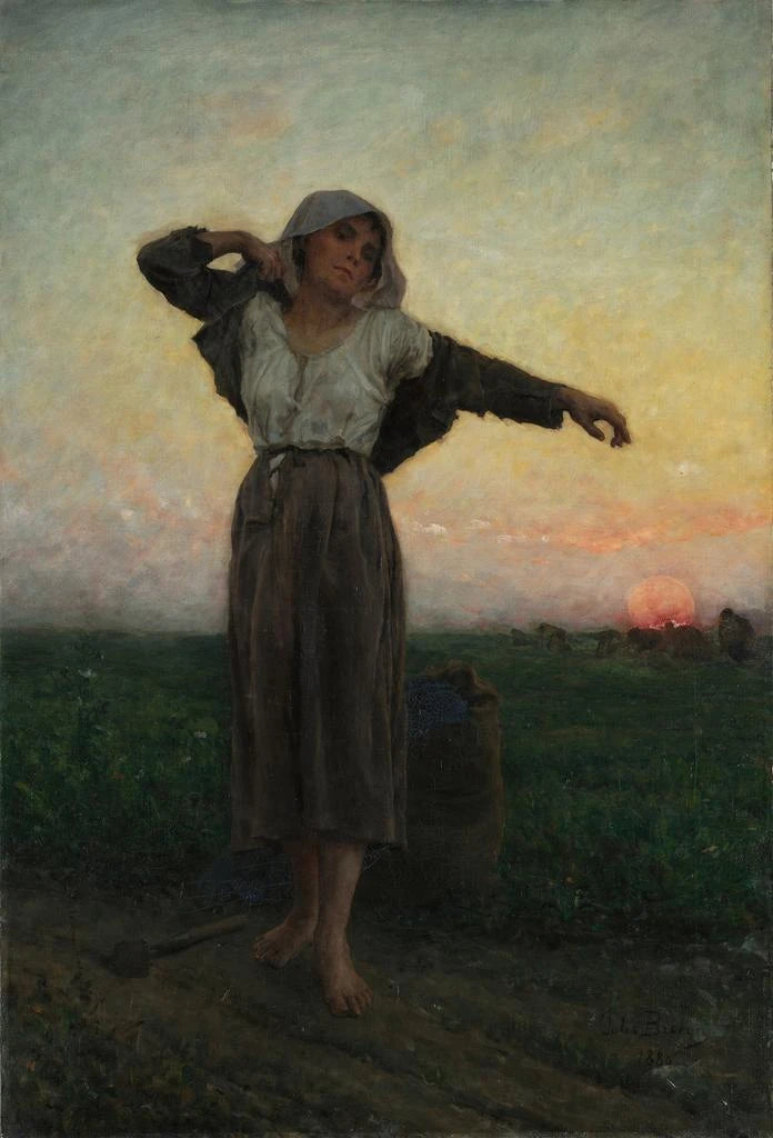 Dans "La glaneuse fatiguée", Jules Breton capture l'essence du travail acharné des femmes des champs. Cette toile évoque une scène de la vie quotidienne où une glaneuse, courbée sous le poids de son labeur, semble à la fois résignée et pleine de dignité. Les couleurs chaudes, dominées par des tons de terre et de vert, créent une atmosphère de sérénité et de mélancolie. La lumière douce qui éclaire le visage de la glaneuse ajoute une dimension presque spirituelle à cette œuvre, invitant le spectateur à ressentir l'effort et la détermination de ces femmes souvent oubliées.