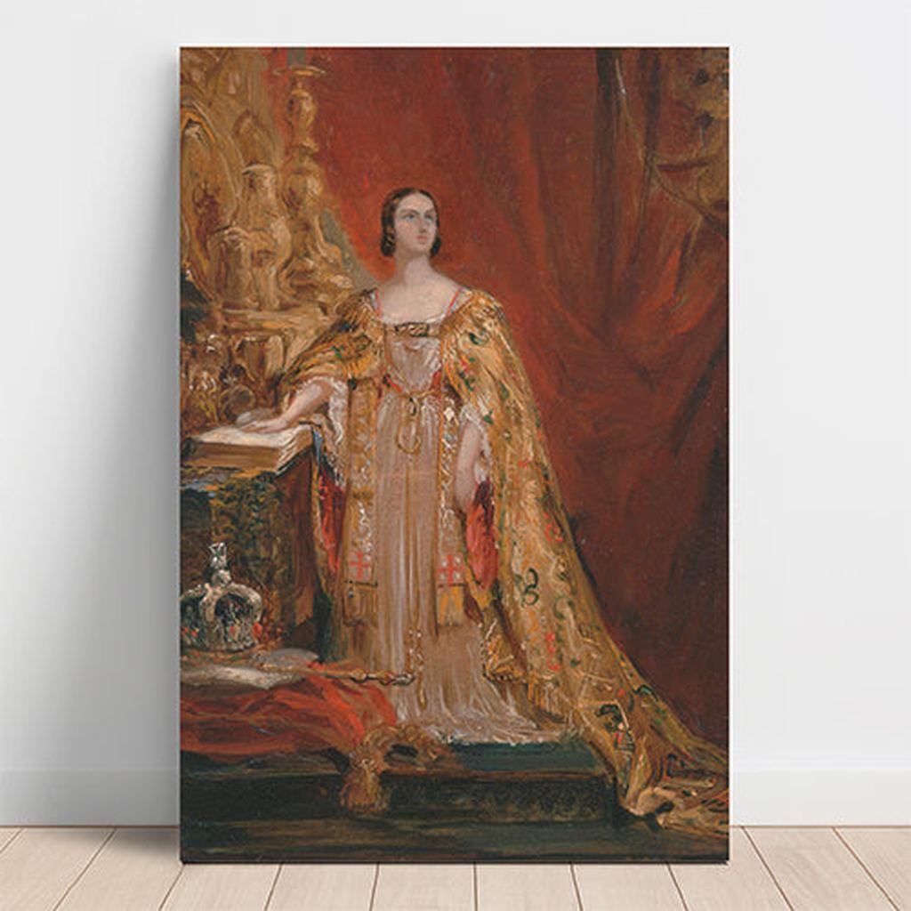 Les détails somptueux de la robe royale, les ornements richement travaillés et l'expression calme et déterminée de la reine témoignent du talent de Sir George Hayter pour capturer l’élégance et la majesté. L’arrière-plan rouge profond renforce l’impression de pouvoir et de royauté qui émane de cette scène.