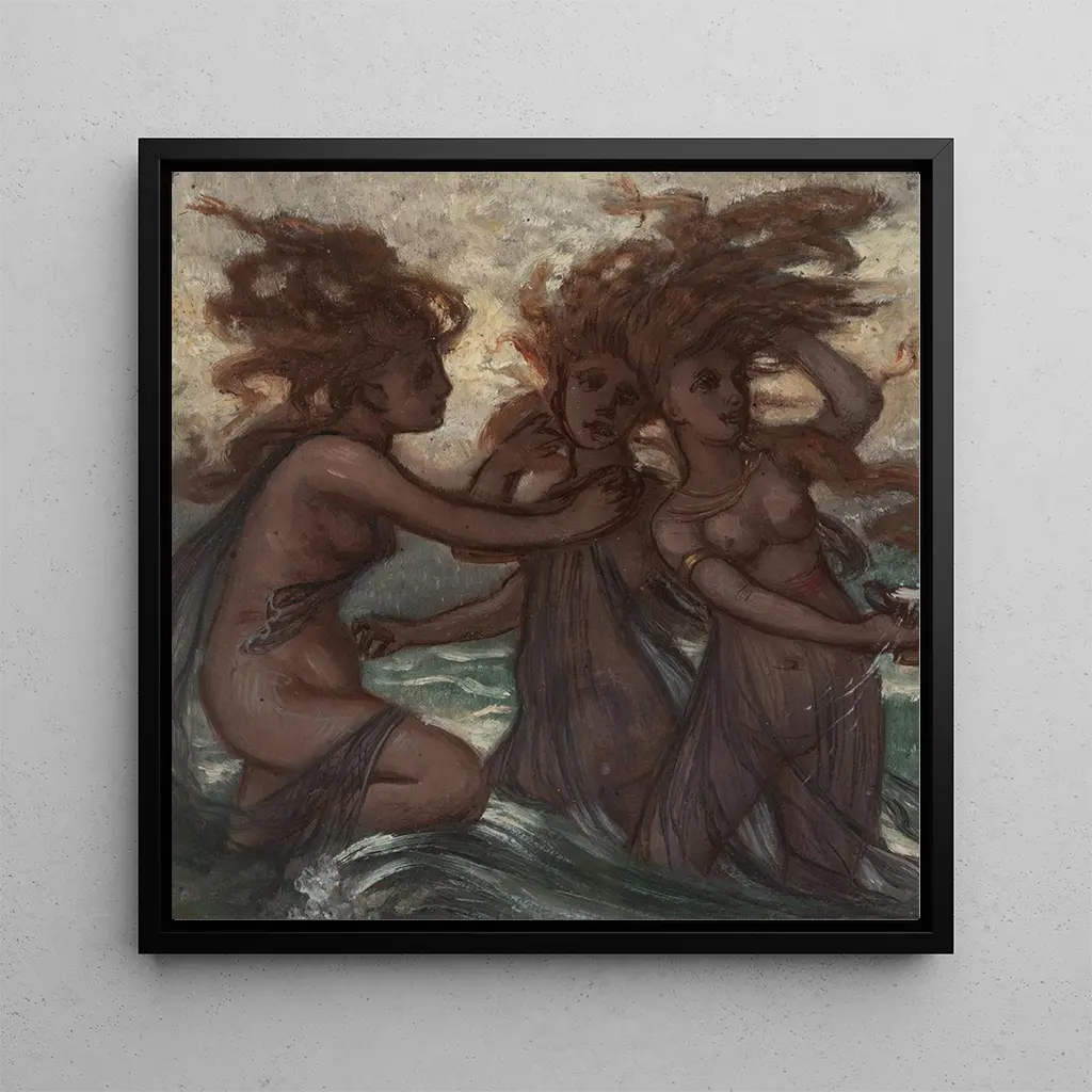 La reproduction de l’œuvre Les Phorcydes d’Elihu Vedder révèle une composition dense où figures humaines et éléments symboliques se répondent dans une palette de tons terreux et d’accents dorés. La scène s’organise autour de lignes sinueuses et d’un jeu d’ombres qui accentue la profondeur dramatique, tandis que la touche précise de Vedder traduit une grande maîtrise du dessin et de la texture. L’atmosphère est à la fois mystique et contemplative: visages expressifs, drapés travaillés et motifs allégoriques créent une émotion visuelle soutenue. Cette interprétation restitue fidèlement la force narrative et la subtile mélancolie de l’original.