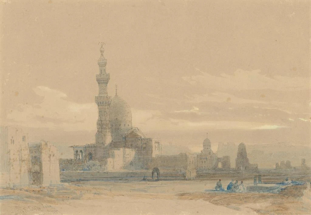 Né en 1796 à Édimbourg, David Roberts est un artiste écossais dont le travail a profondément marqué le mouvement romantique. Voyageur inflexible, il a parcouru l'Égypte et le Moyen-Orient, s’inspirant des paysages et de l'architecture qu'il rencontrait. Son style, caractérisé par un souci du détail et une atmosphère dramatique, a influencé de nombreux artistes de son époque. "Les tombeaux des califes" s'inscrit dans une série d'œuvres où il immortalise des sites historiques, témoignant d'un intérêt croissant pour l'Orientalisme au XIXe siècle. Ses œuvres sont non seulement des représentations visuelles, mais aussi des récits de découvertes et d'aventures, offrant un aperçu précieux de cultures lointaines.