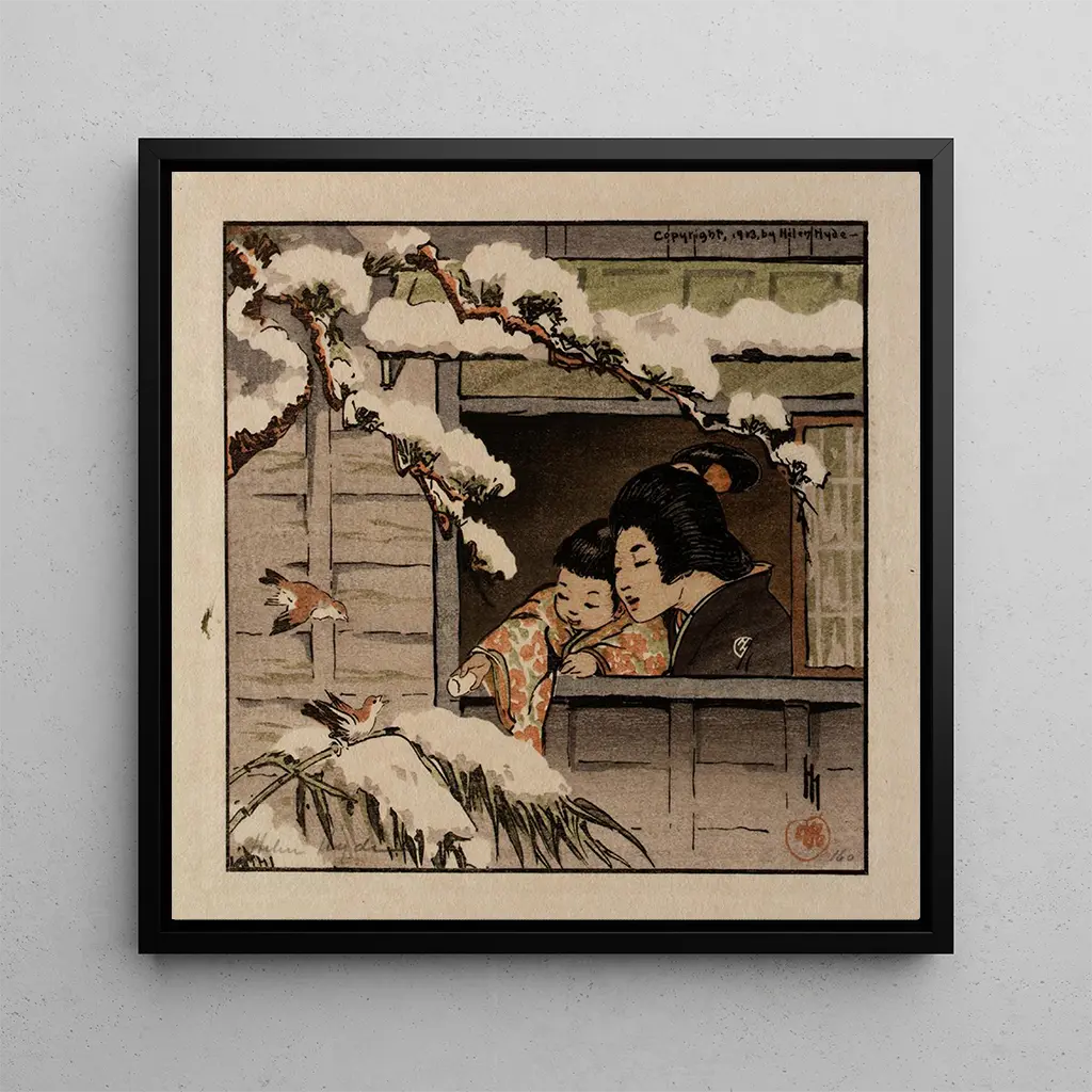 La composition de Mes voisins évoque un instant saisi sur le vif, où les personnages et les motifs se répondent dans une palette douce et contrastée. Les teintes délicates, héritées de l'esthétique du ukiyo-e, alternent entre tons chauds et accents plus soutenus, créant une profondeur sereine. La technique de Helen Hyde transcrit avec finesse les textures des tissus et la lumière sur les visages, conférant à la scène une présence presque tactile. On ressent une atmosphère à la fois contemplative et vivante, invitant le regard à explorer chaque détail du cadre domestique.