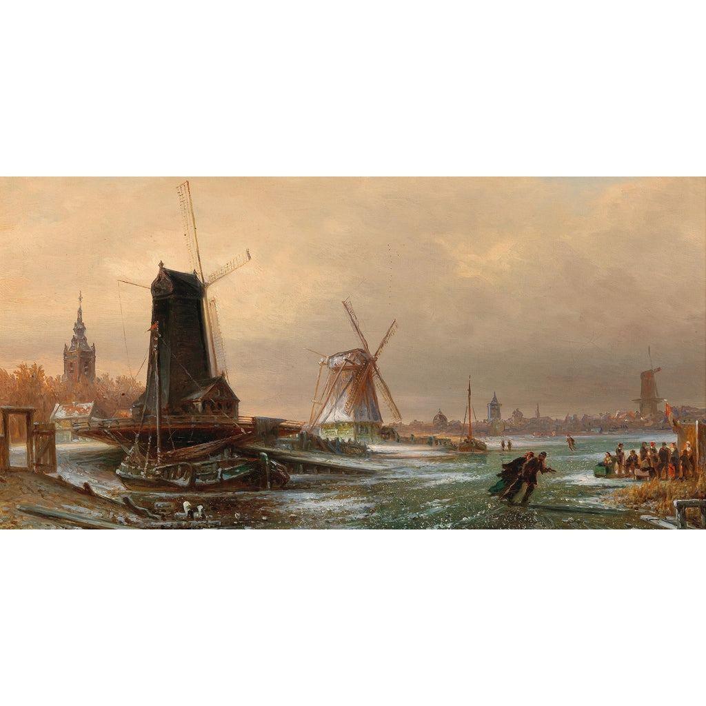 Cette scène pittoresque, peinte par Elias Pieter van Bommel (1819-1890), illustre un paysage hollandais animé, dominé par plusieurs moulins emblématiques situés près d’Amsterdam. Dans un style réaliste empreint de détails soignés, l’artiste capture l’essence des hivers hollandais avec un décor mêlant architecture, nature et vie quotidienne.
