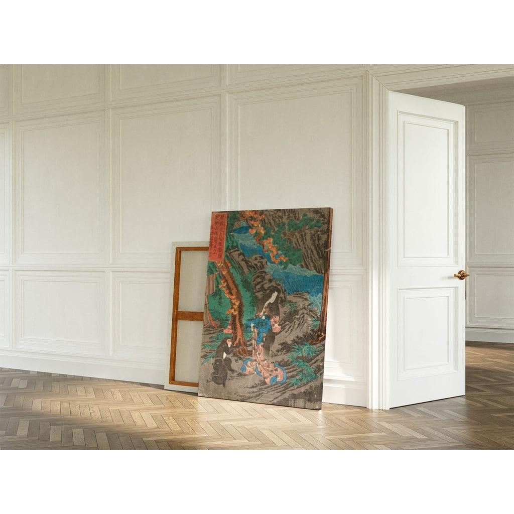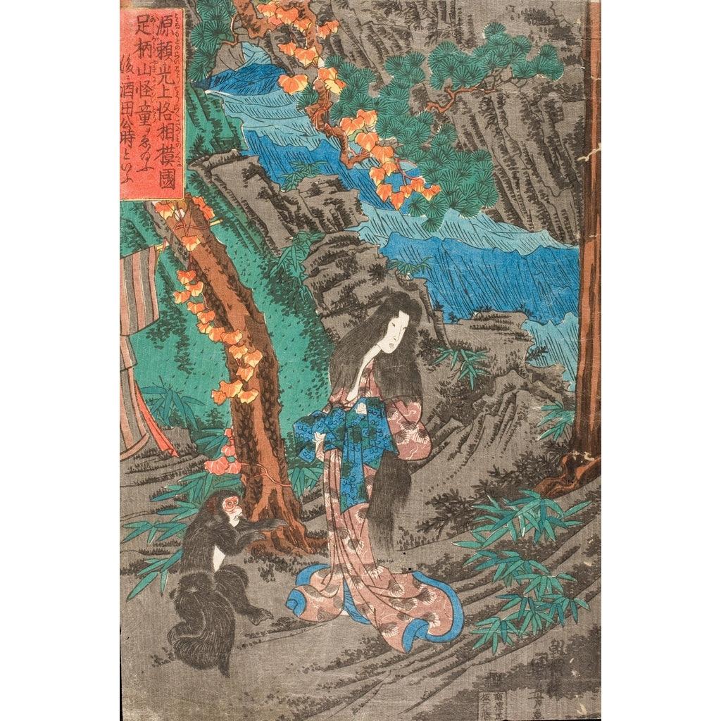 Tableau En route pour Kyoto, Minamoto no Raiko rencontre Kaidomaru dans les montagnes d'Ashigara de la province de Sagami et l'emploie comme vassal - Utagawa Kuniyoshi | Reproduction
