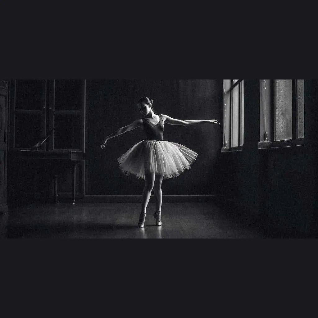 Intéressé par une décoration raffinée pour votre espace ? Laissez-moi vous présenter cette impression photo en noir et blanc. Cette œuvre capture la pure essence de la danse classique dans un environnement qui évoque une tranquillité mystique. Chaque détail de cette photo, des reflets lumineux sur le parquet à la silhouette gracieuse de la danseuse, évoque un sentiment d'élégance et de passion.