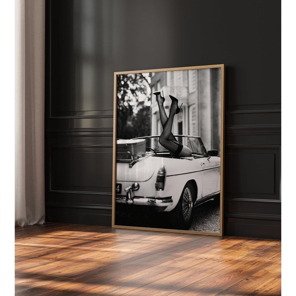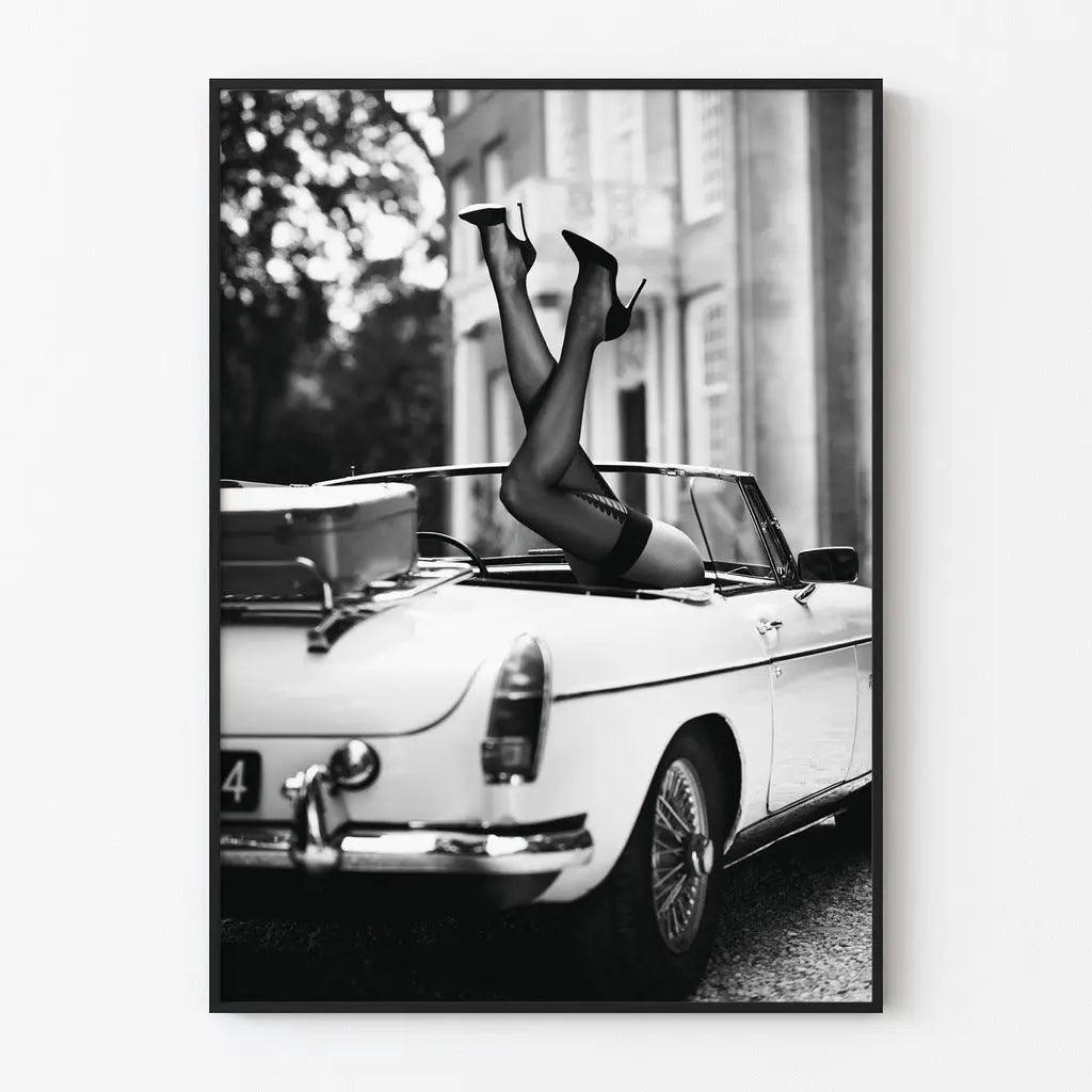 Découvrez le poster "Talons au Vent", une œuvre captivante qui incarne l'essence du style et de l'élégance intemporelle. Ce visuel en noir et blanc met en scène les jambes d'une femme, suspendues avec insouciance et grâce à l'arrière d'une voiture décapotable vintage. Paré de talons hauts noirs et de bas raffinés, ce motif capture un moment de liberté et de joie pure, évoquant les escapades spontanées des belles époques.
