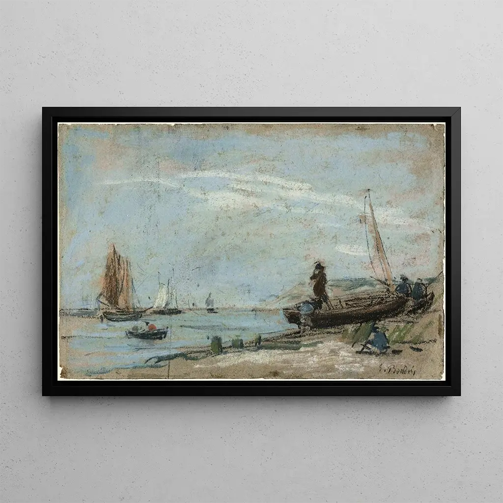 Dans cette toile, Eugène Boudin nous transporte sur une plage animée, où les bateaux de pêche s'échouent doucement sur le rivage. Les nuances délicates de bleu et de sable, associées à des touches de lumière dorée, créent une atmosphère paisible et contemplative. La technique impressionniste de Boudin, avec ses coups de pinceau légers et fluides, donne vie à la mer et au ciel, tout en capturant l'essence du moment. Les silhouettes des pêcheurs et des voiles blanches ajoutent une dimension humaine à ce paysage maritime, invitant à la rêverie et à l'évasion.