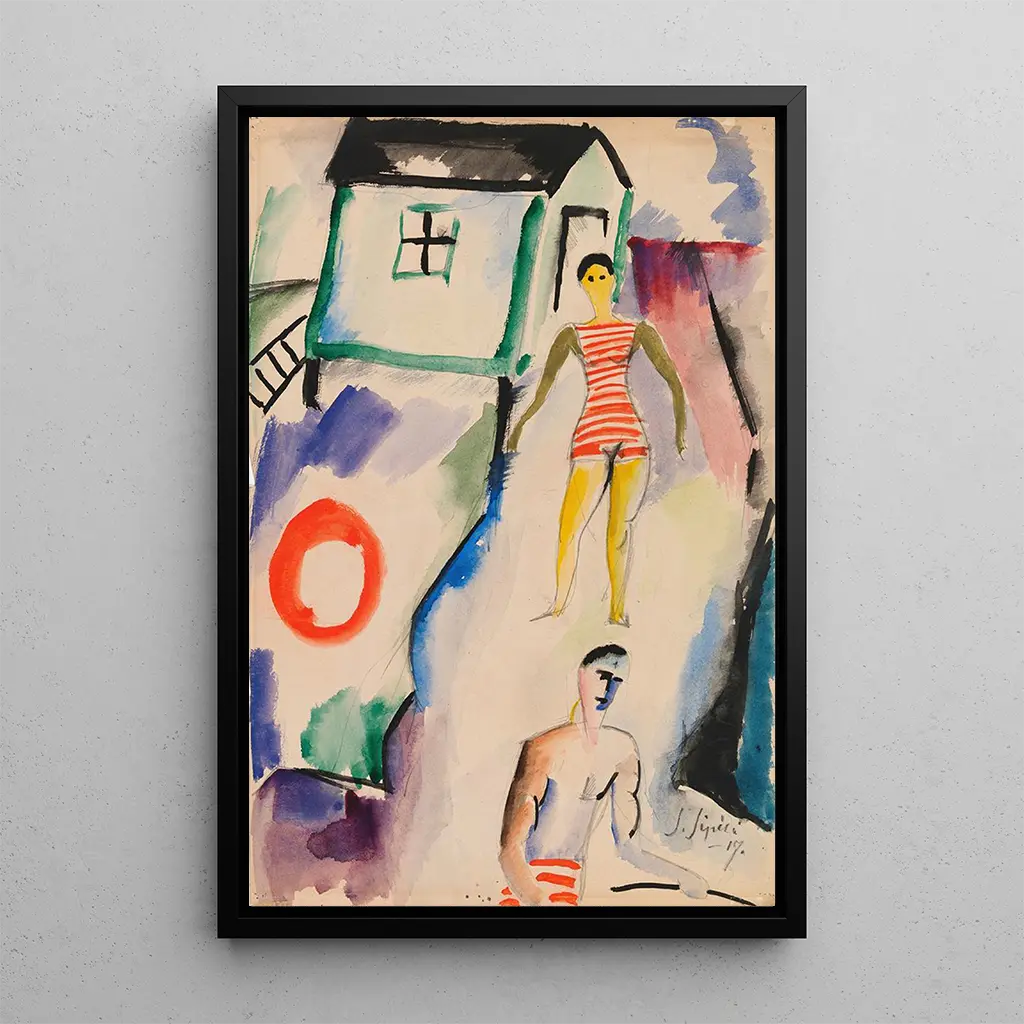 La reproduction de l'œuvre Plage de Sulho Sipilä capture l'essence d'une journée ensoleillée au bord de la mer. Les teintes dorées du sable se mêlent aux bleus profonds de l'eau, créant un contraste saisissant qui attire le regard. La technique de Sipilä, caractérisée par des coups de pinceau fluides et expressifs, donne vie à cette scène balnéaire, où le mouvement des vagues semble presque palpable. Chaque élément, des parasols aux silhouettes des baigneurs, contribue à une atmosphère joyeuse et vivante, invitant le spectateur à ressentir la chaleur du soleil et le doux bruit des vagues.