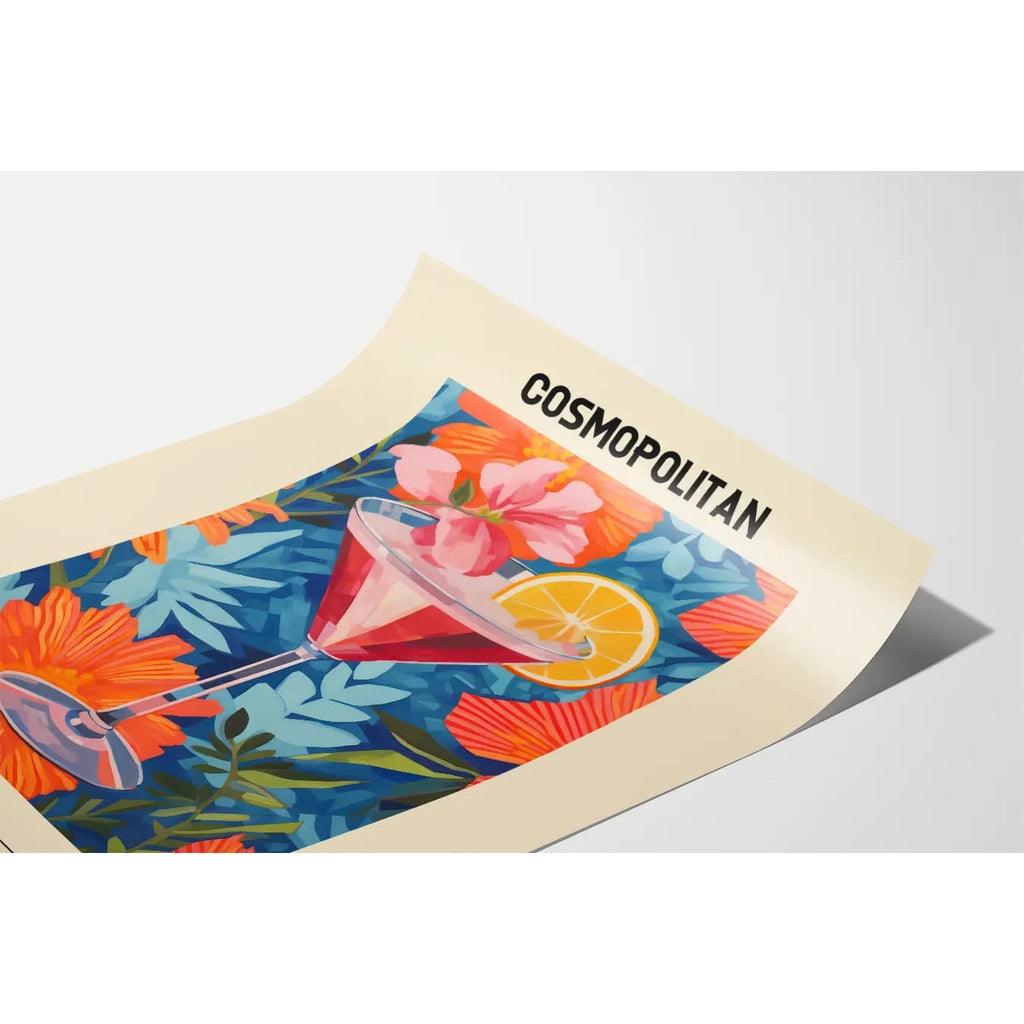 Le poster "Cosmopolitan" illustre un verre de Cosmopolitan élégamment présenté, avec ses couleurs vibrantes de cranberry et de citron vert. Le cocktail est délicatement garni d'une tranche de citron vert sur le bord du verre, posé contre un fond stylisé qui évoque les lumières de la ville et la vie nocturne.
