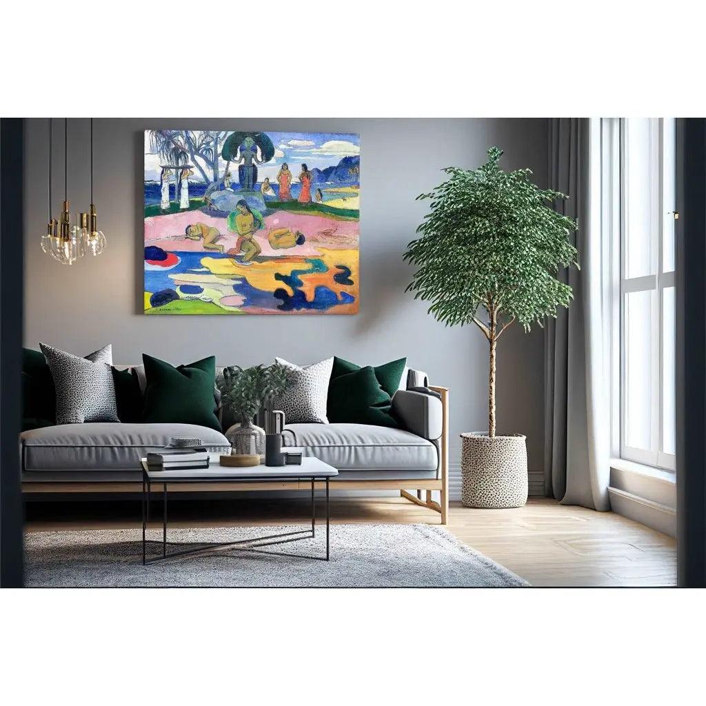 Découvrez la magie de la Polynésie à travers cette reproduction exquise de "Mahana no atua" de Paul Gauguin, une pièce maîtresse de l'art post-impressionniste. Réalisée durant sa période