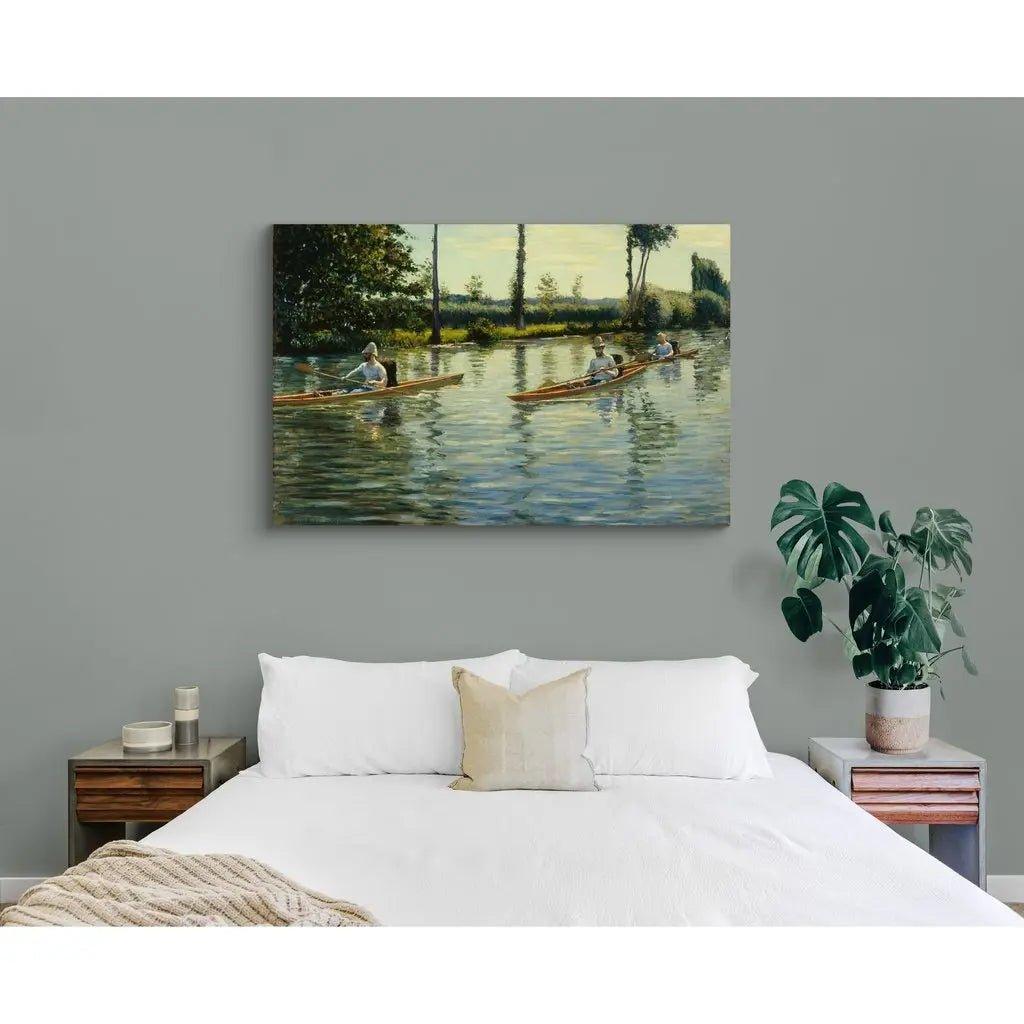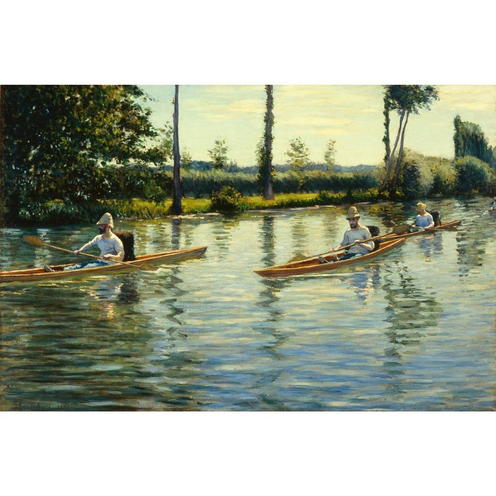 Les périssoires, étroites et élégantes, glissent sur l'eau, capturant la lumière et créant un effet miroitant qui est magnifiquement rendu dans cette reproduction. L'attention méticuleuse aux détails de Caillebotte, de la texture de l'eau aux expressions concentrées des rameurs, offre une fenêtre sur un moment de loisir tranquille de la fin du XIXe siècle.