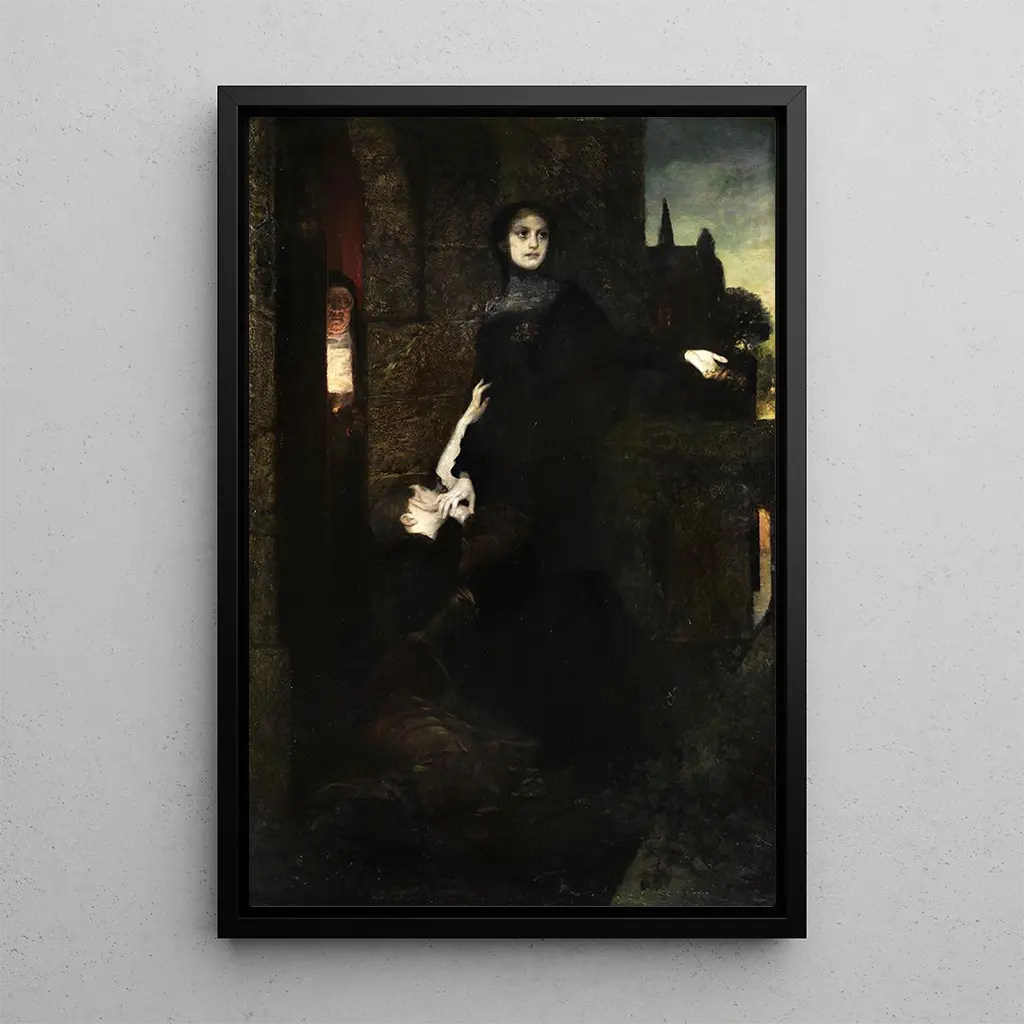 La reproduction de la Scène romantique de Ferdinand Keller évoque une atmosphère douce et mélancolique, où les personnages semblent capturés dans un moment d’intimité. Les couleurs chaudes, dominées par des nuances de rouge et d’or, créent une ambiance chaleureuse et accueillante. La technique de Keller, qui mêle habilement le réalisme à une touche impressionniste, donne vie à cette scène, rendant les détails des visages et des vêtements presque palpables. L’arrière-plan flou, suggérant un paysage bucolique, invite à la contemplation et à l’évasion, transportant le spectateur dans un monde de rêve et de romance.