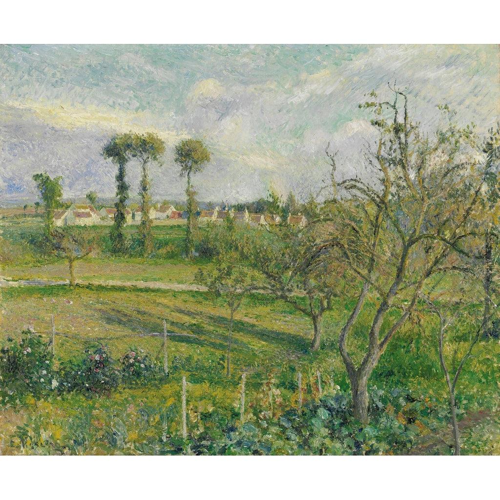 La palette de couleurs éclatantes, associée à une technique de pinceau unique, donne vie à la scène, créant ainsi une atmosphère à la fois sereine et dynamique. L'utilisation audacieuse de la lumière et de l'ombre permet de ressentir la chaleur d'un jour qui s'achève, invitant le spectateur à une contemplation tranquille. Cette représentation de la campagne française est un reflet de la passion de Pissarro pour son environnement et son engagement envers la capture de ses nuances.