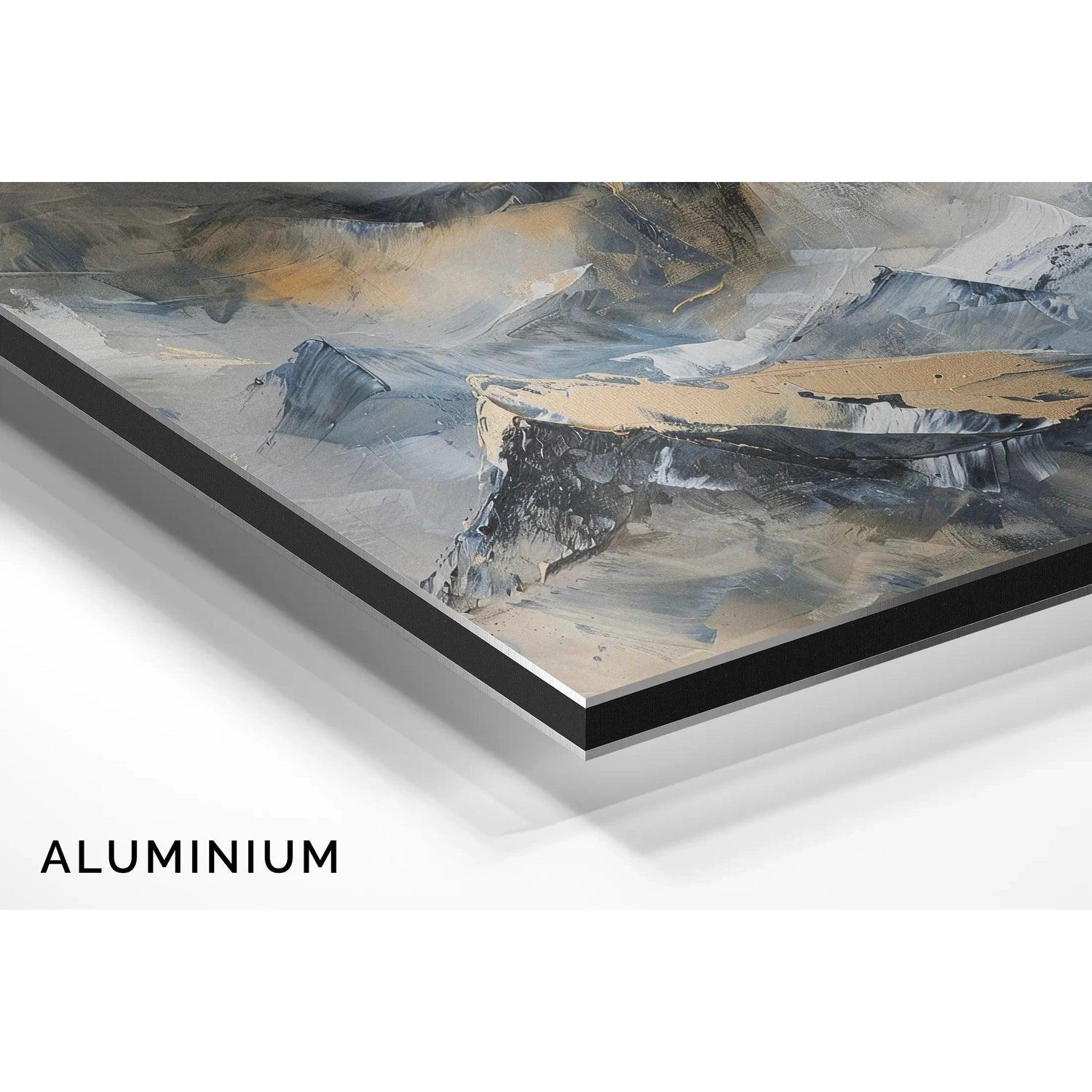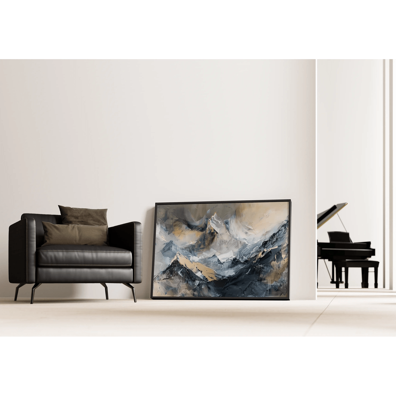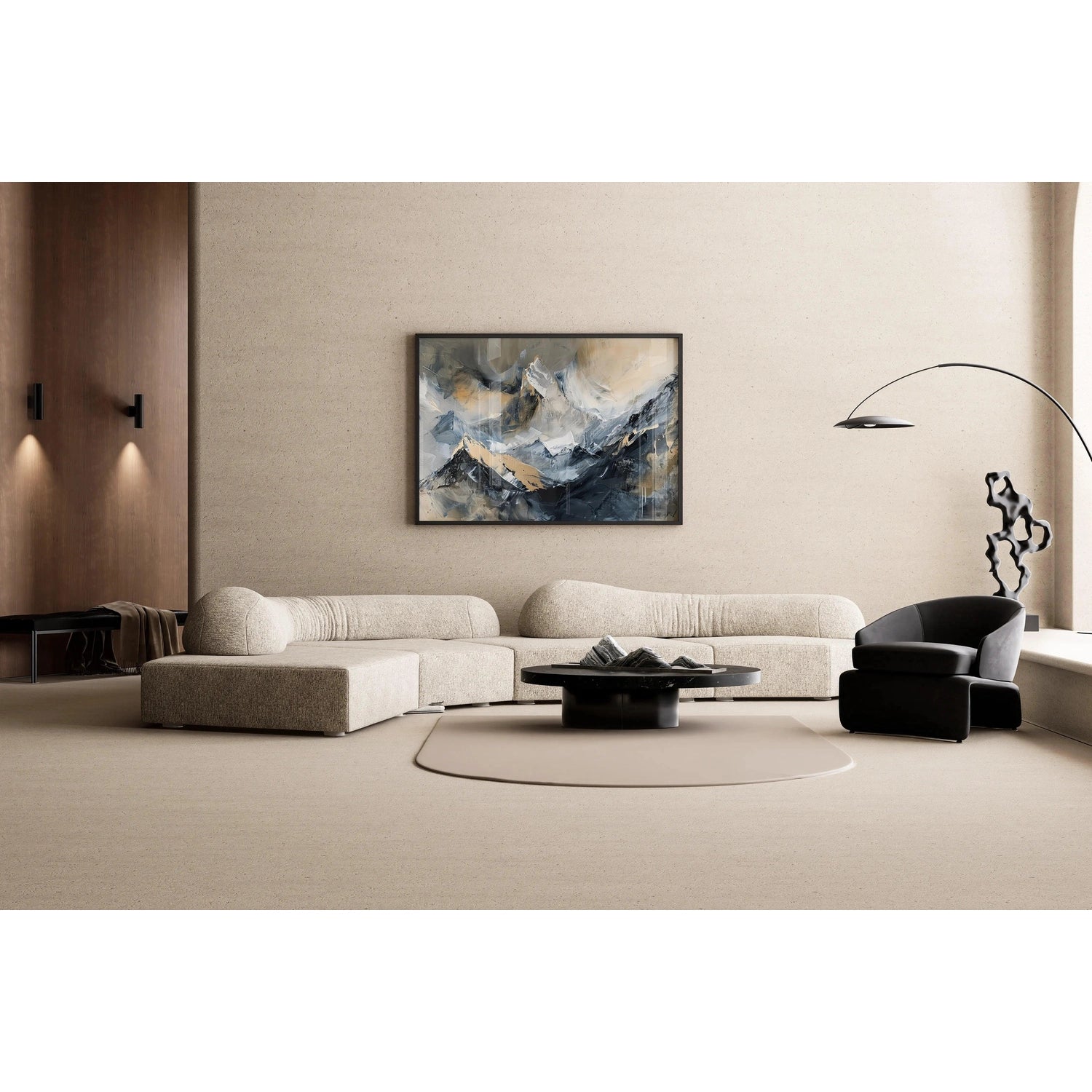 Tableau Abstrait – Élévation Minérale | Affiche Murale Montagne Stylisée aux Tons Neutres et Détails Dorés | Déco Élégante pour Salon ou Bureau Moderne