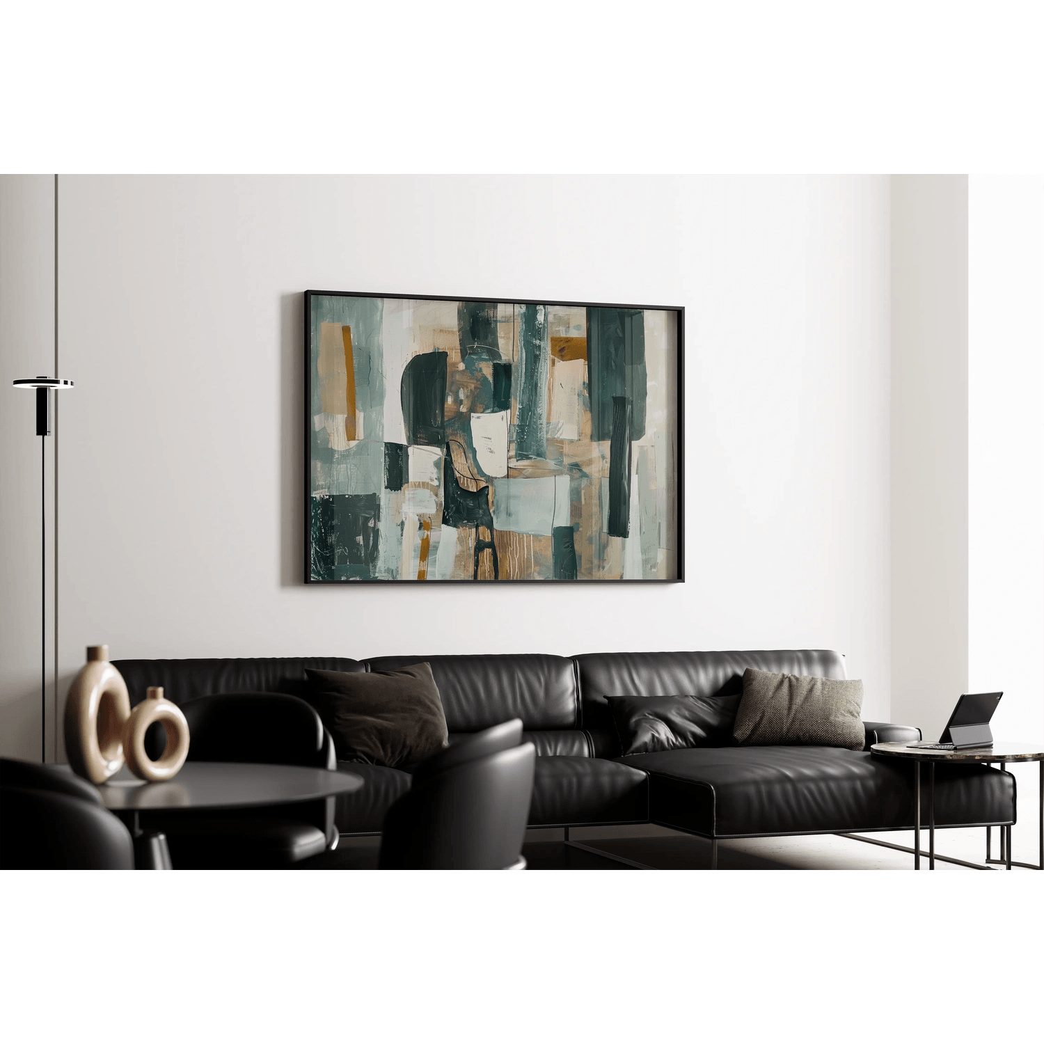 Élégant, structuré et parfaitement équilibré, ce tableau abstrait joue avec les formes et les textures pour créer une atmosphère à la fois contemporaine et apaisante. Les couleurs sourdes — vert olive, gris minéral, blanc cassé et brun terreux — s'entrelacent dans une composition géométrique subtile, presque architecturale.
