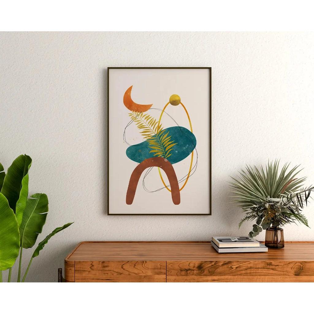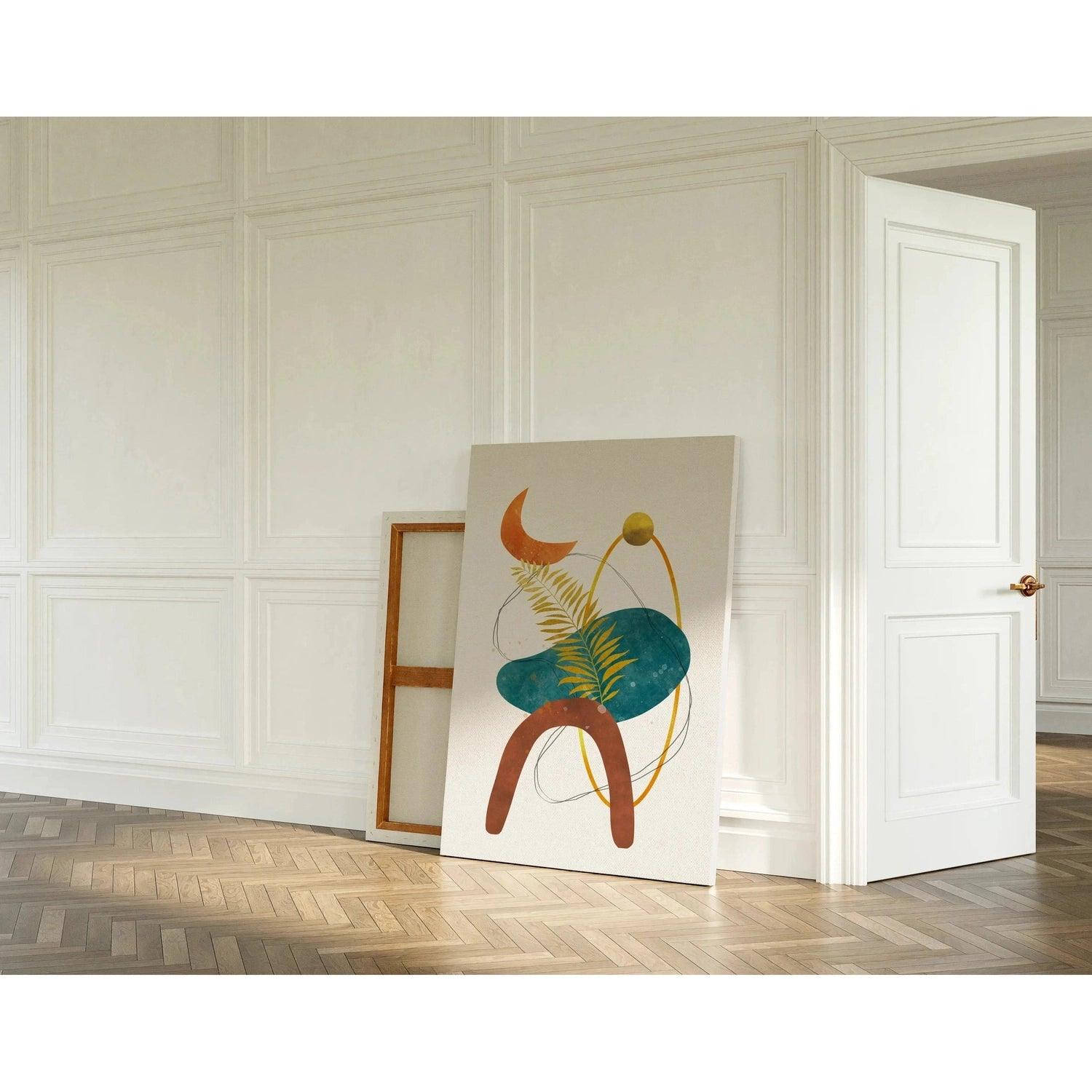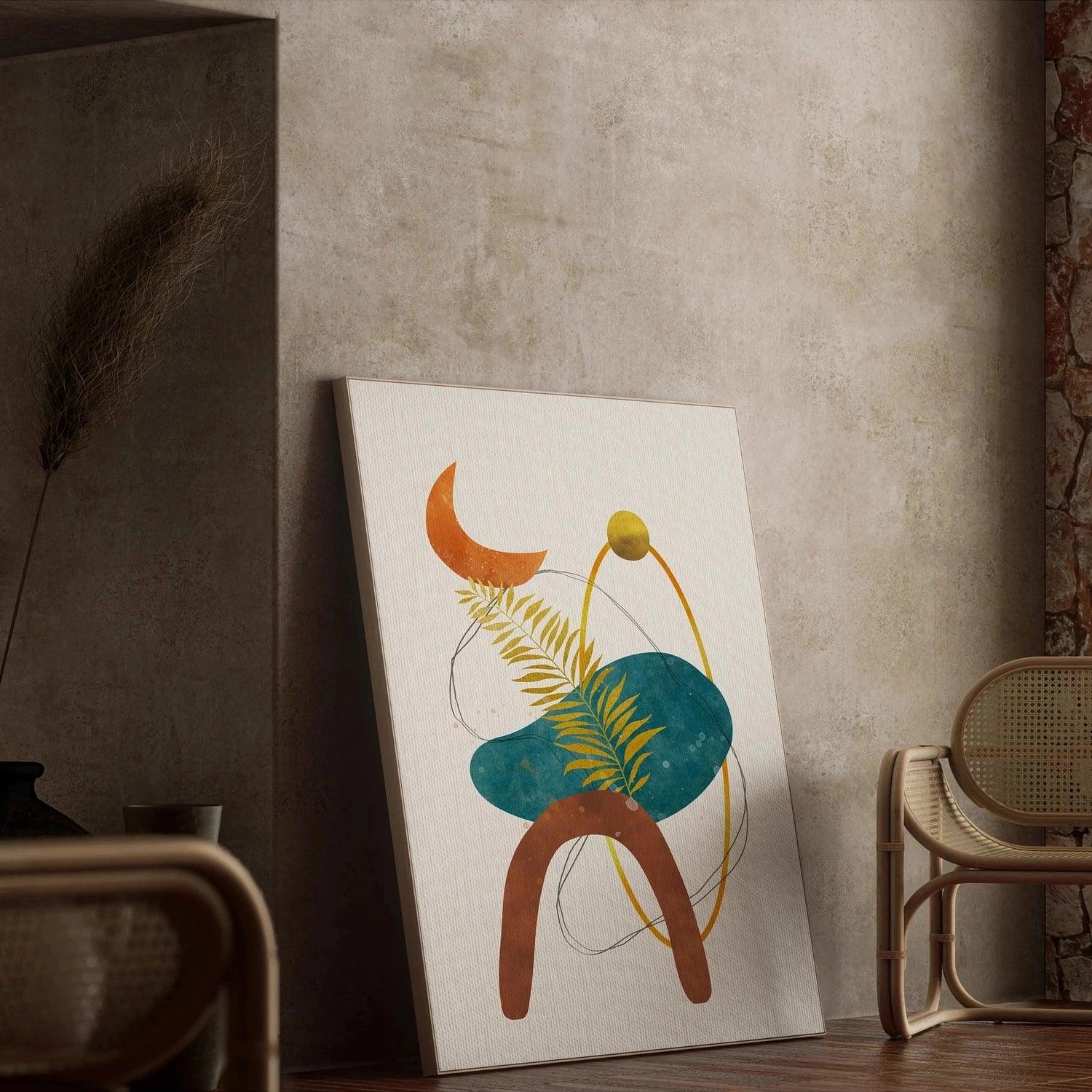 "Éclipse Botanique" est un tableau décoratif à la fois poétique et abstraite qui combine des formes naturelles et géométriques avec une palette de couleurs terreuses et profondes. L'illustration présente une feuille délicate en contraste avec des formes rondes et fluides, dont un croissant de lune orangé et une sphère dorée, créant un équilibre entre le monde naturel et les motifs abstraits. Les nuances de bleu, de vert, d’ocre et de terracotta évoquent la nature et les cycles lunaires, apportant une touche apaisante et mystique à votre intérieur.