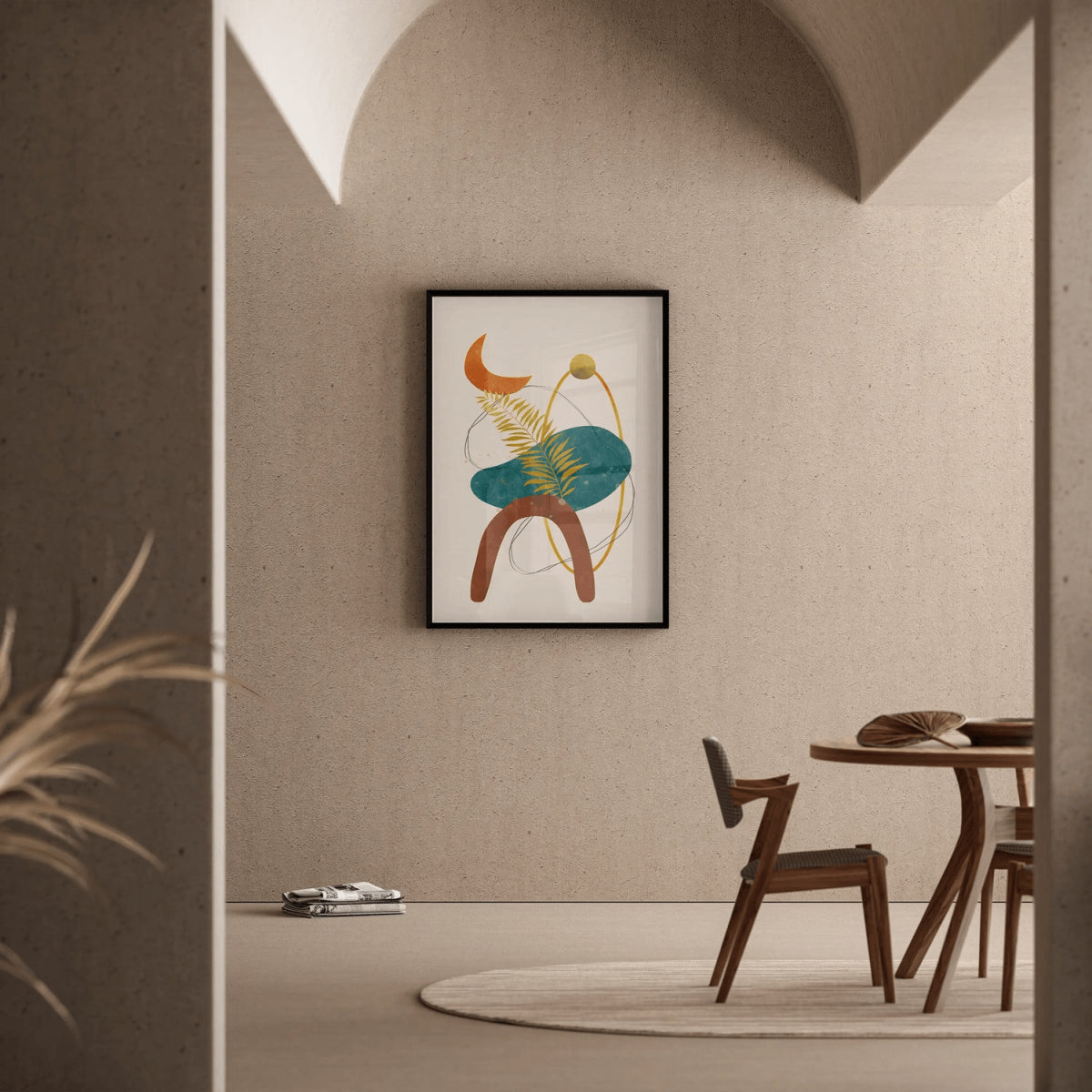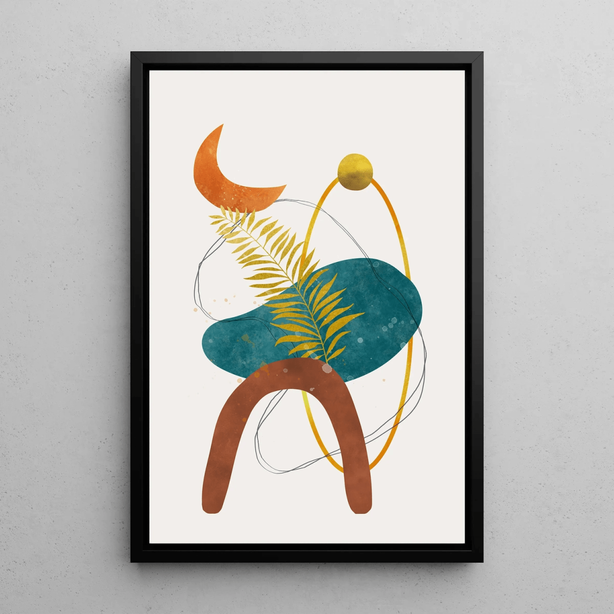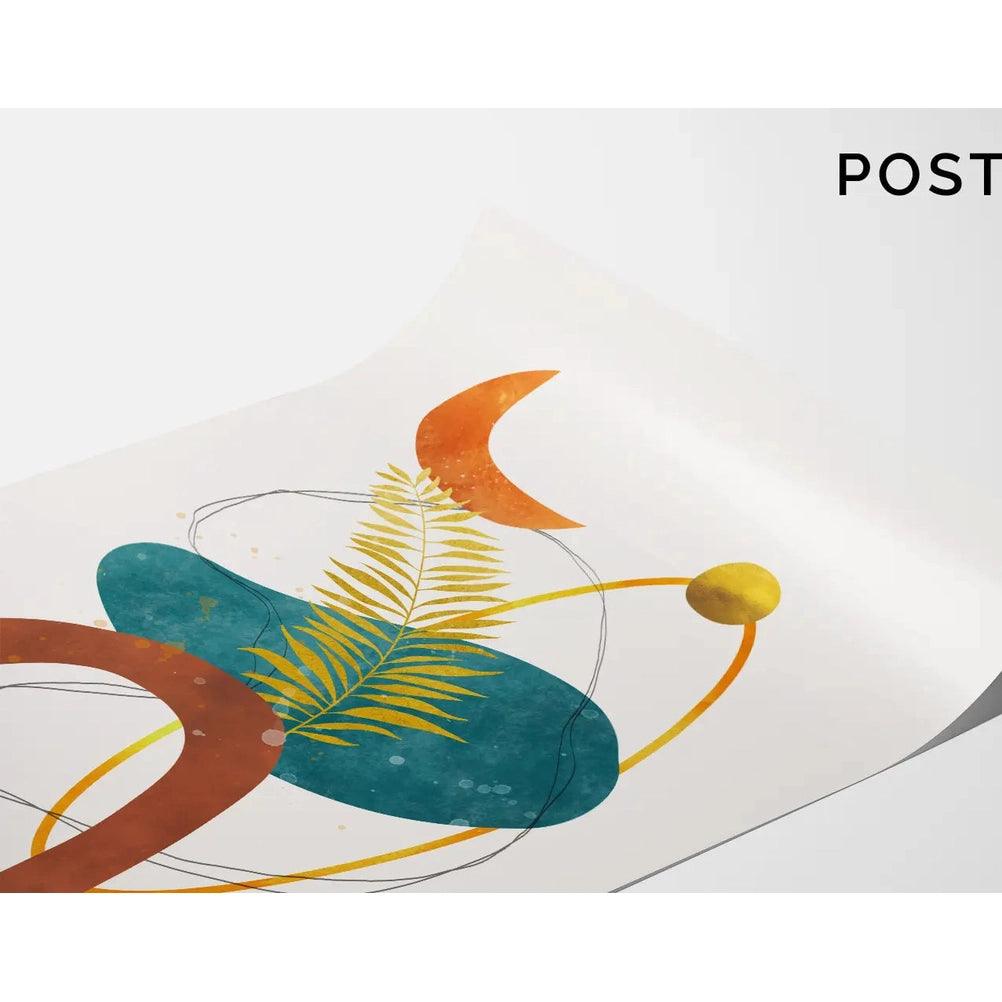 "Éclipse Botanique" est un tableau décoratif à la fois poétique et abstraite qui combine des formes naturelles et géométriques avec une palette de couleurs terreuses et profondes. L'illustration présente une feuille délicate en contraste avec des formes rondes et fluides, dont un croissant de lune orangé et une sphère dorée, créant un équilibre entre le monde naturel et les motifs abstraits. Les nuances de bleu, de vert, d’ocre et de terracotta évoquent la nature et les cycles lunaires, apportant une touche apaisante et mystique à votre intérieur.