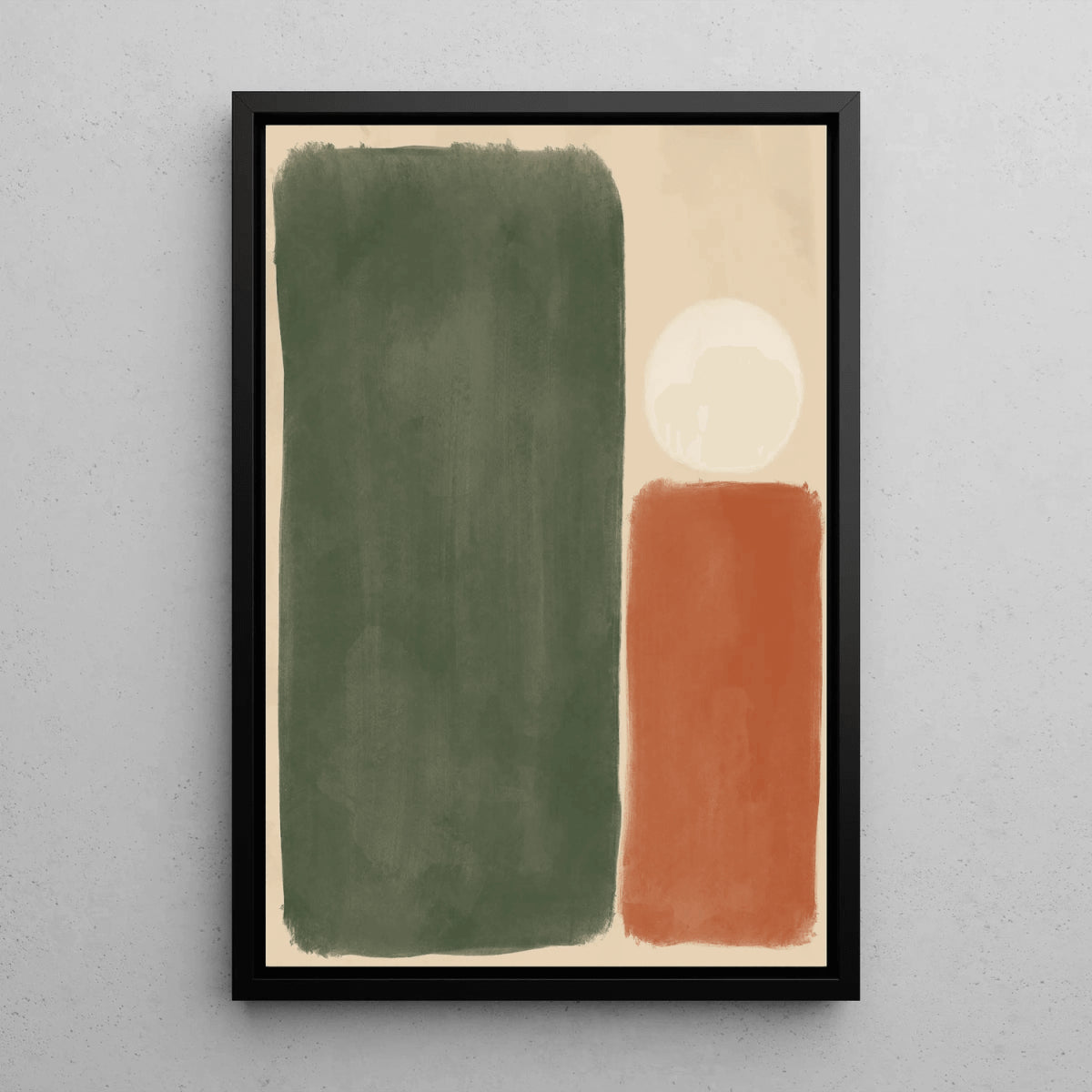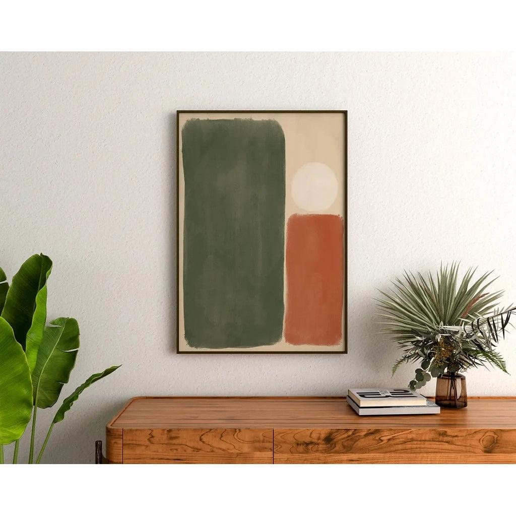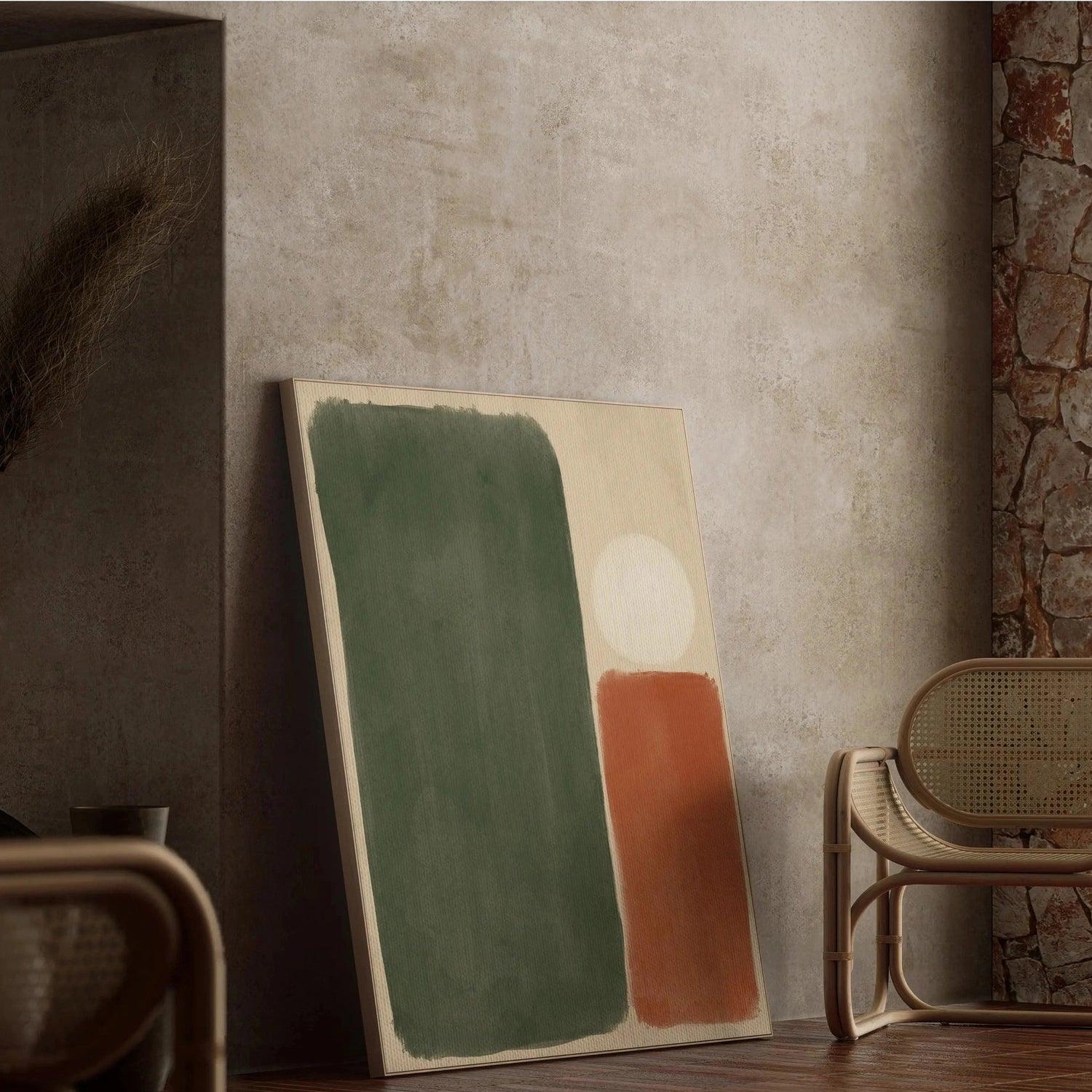 "Sérénité Éclectique" est une œuvre minimaliste qui capture l'essence du style bohème avec une palette de couleurs chaudes et naturelles. Les formes simples et douces en vert forêt, terracotta et blanc créent une composition à la fois apaisante et équilibrée, parfaite pour un intérieur décontracté et moderne. Ce tableau décoratif est l'incarnation du retour aux éléments naturels, une ode à la simplicité et à la tranquillité.