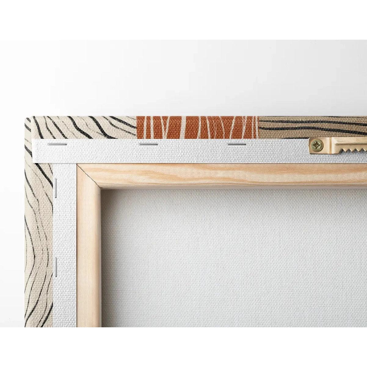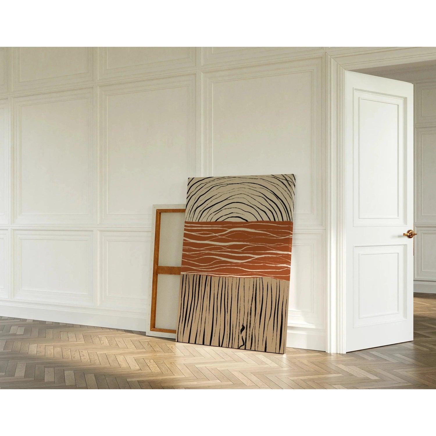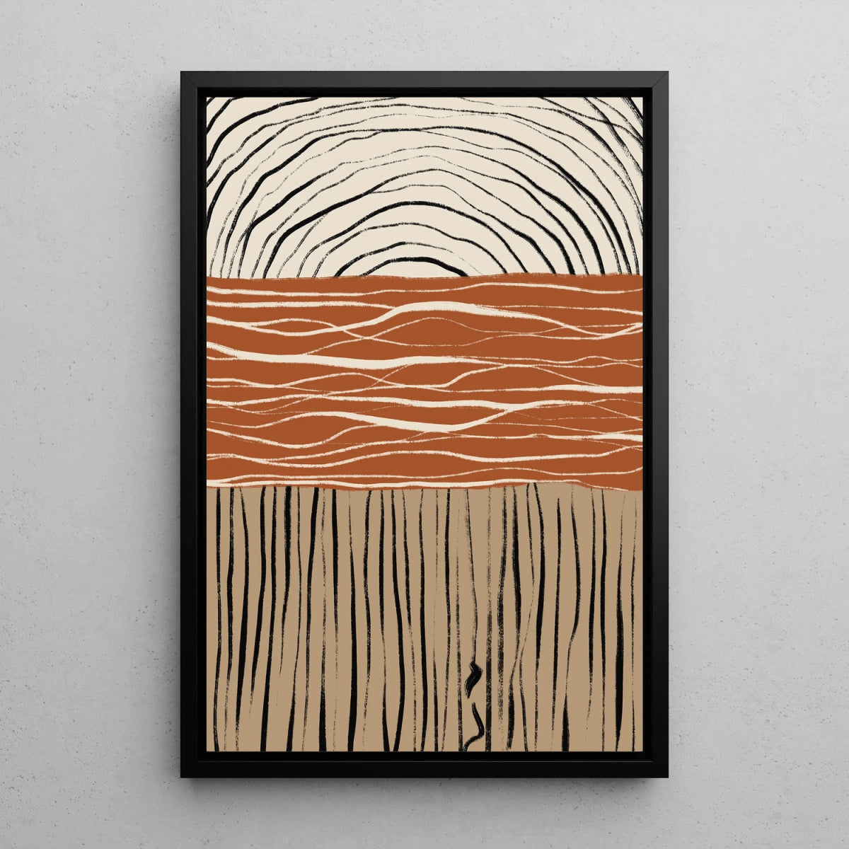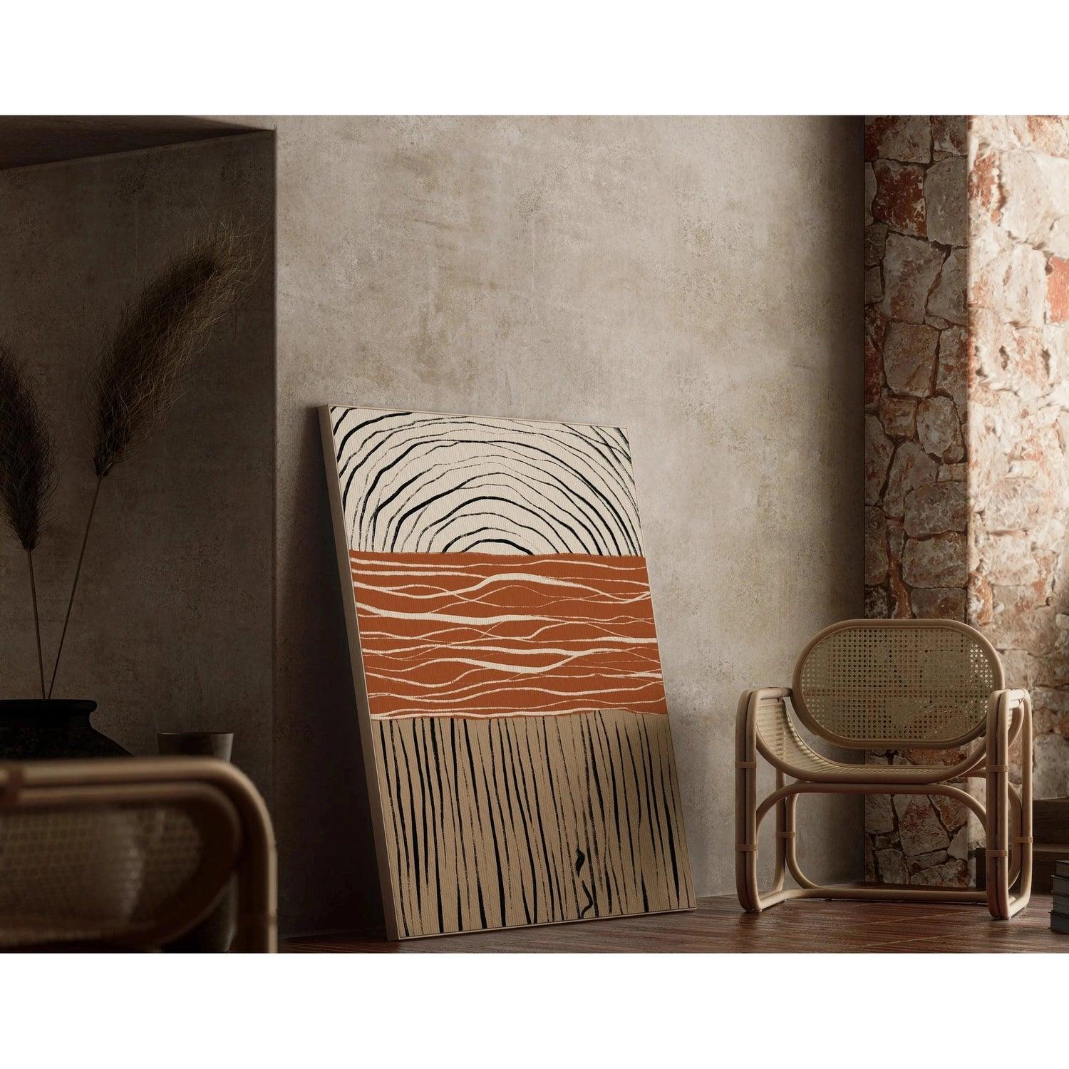 Le tableau décoratif "Vibrations Bohèmes" capture l'essence de la nature à travers un motif ondulant et abstrait, évoquant les mouvements fluides des éléments naturels comme l'eau et le vent. Avec ses lignes noires dessinant des vagues et des sillons sur des teintes chaudes de terracotta et de beige, cette œuvre dégage une harmonie visuelle qui inspire calme et sérénité.