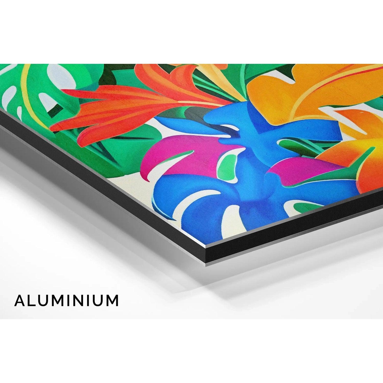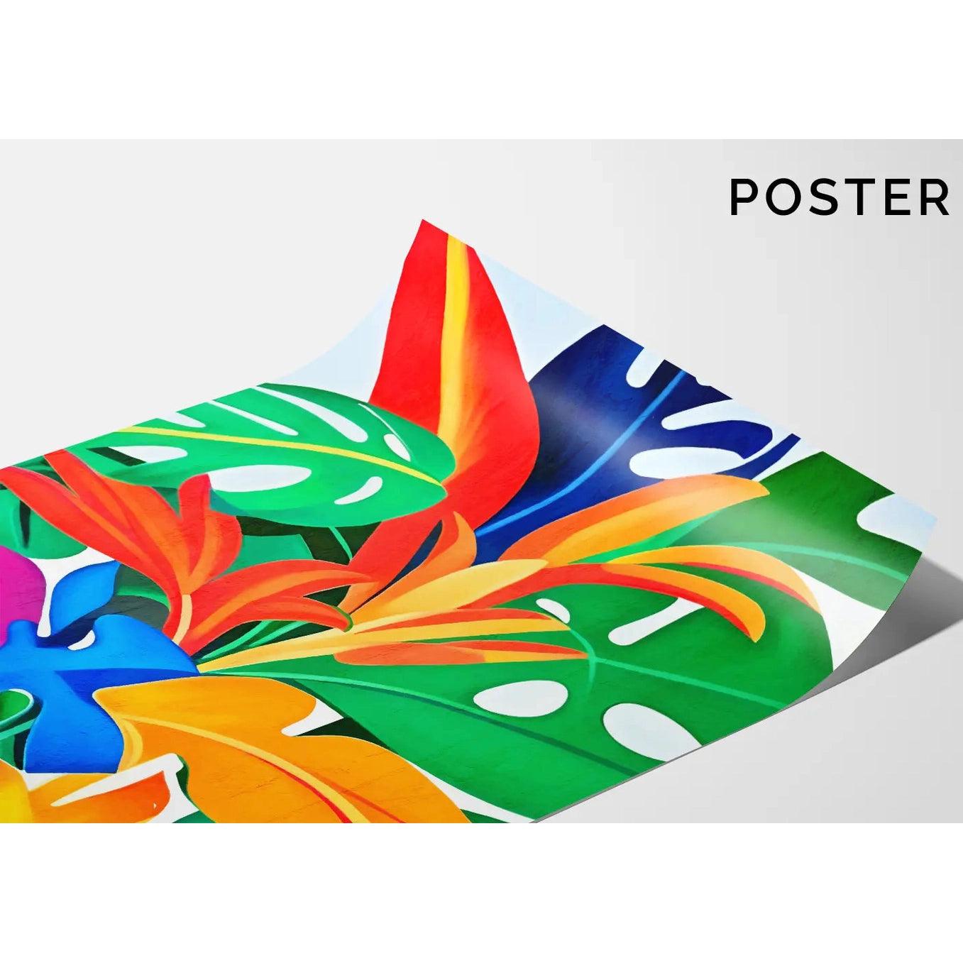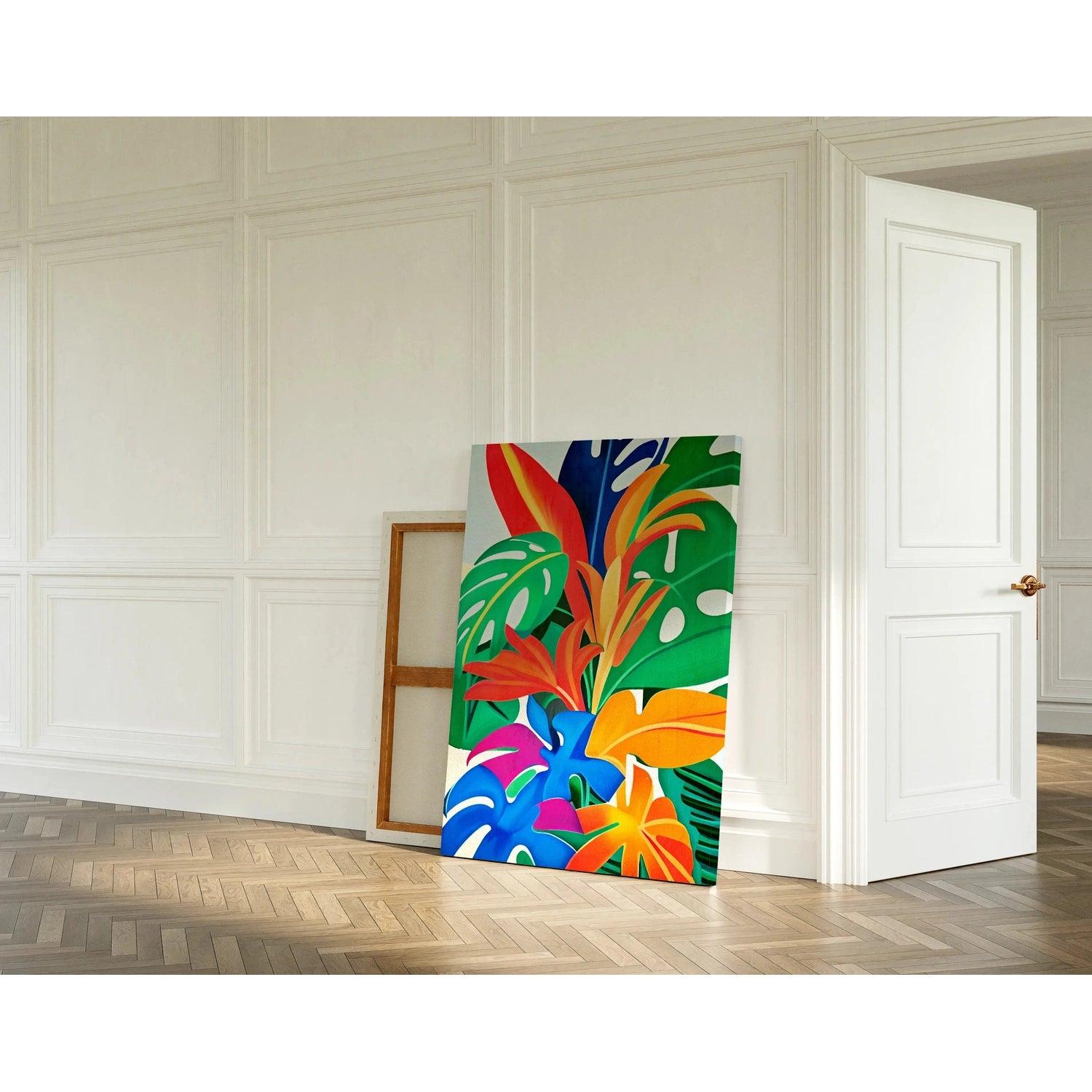 Faites entrer la chaleur et l’exotisme dans votre intérieur avec ce tableau coloré inspiré de la jungle tropicale. Des feuilles de monstera, de bananier et de plantes imaginaires s'entrelacent dans une palette flamboyante de vert vif, orange, rouge, jaune soleil, rose fuchsia et bleu électrique.