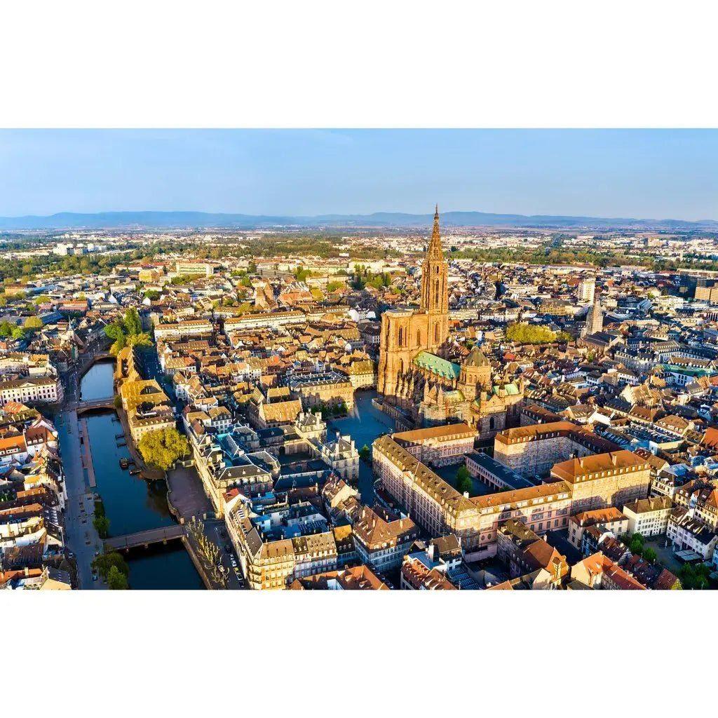 Découvrez l'essence captivante de Strasbourg à travers cette photographie aérienne saisissante, qui révèle une ville où le charme historique se mêle harmonieusement à l'énergie urbaine. Le premier rayon du soleil caresse les toits en tuiles rouges, tandis que la cathédrale emblématique de Strasbourg, avec sa flèche délicate et son architecture gothique, se dresse fièrement au-dessus de la ville, un témoignage silencieux de l'histoire et de la culture riche de la région.
