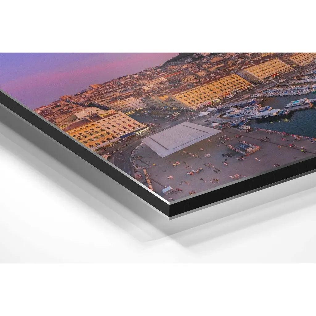 La place située en bordure du port est animée par une foule qui profite des derniers instants du jour, ajoutant une dimension humaine à ce paysage urbain. La transition des lumières urbaines qui s'allument, contrastant avec le ciel adouci par le couchant, invite à la contemplation et rappelle le dynamisme incessant de cette ville méditerranéenne.