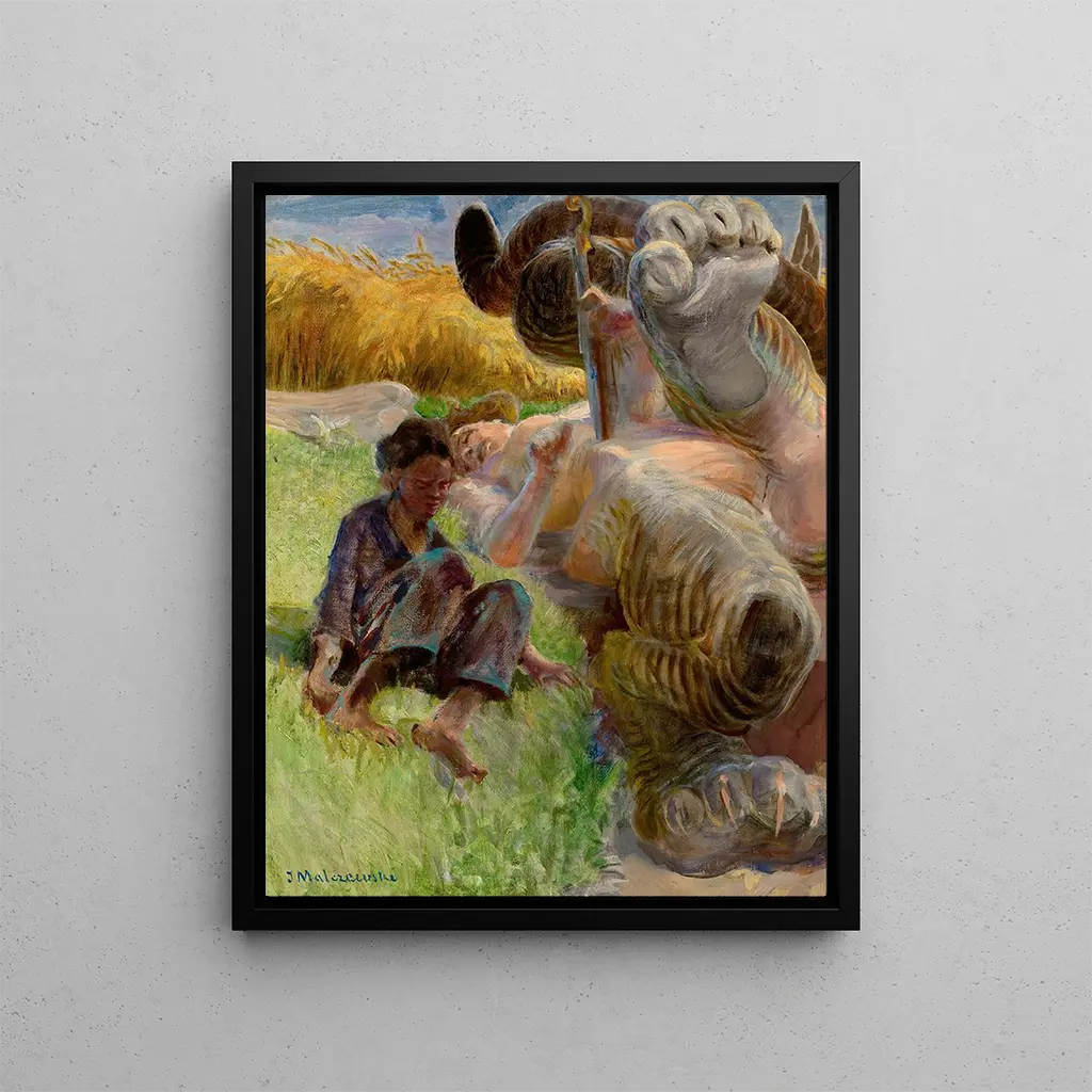 Reproduction Un berger et une harpie - Jacek Malczewski – Introduction captivante Dans l'univers fascinant de l'art polonais, l'œuvre "Un berger et une harpie" de Jacek Malczewski se distingue par son audace et sa profondeur symbolique. Cette peinture, qui évoque à la fois la beauté et le mystère, invite le spectateur à plonger dans un monde où la nature et le fantastique s'entrelacent. Le tableau, à travers ses couleurs vibrantes et ses formes délicates, raconte une histoire qui transcende le temps et l'espace, captivant l'imagination de tous ceux qui l'observent. La représentation d'un berger, figure emblématique de la pastoralité, se trouve ici confrontée à une harpie, créature mythologique, créant ainsi un dialogue entre le réel et l'imaginaire. Cette dualité, omniprésente dans l'œuvre, est le reflet des luttes intérieures de l'humanité, rendant la peinture d'autant plus poignante. Style et singularité de l’œuvre Le style de Jacek Malczewski est marqué par un symbolisme riche et une approche poétique de la représentation. Dans "Un berger et une harpie", l'artiste déploie une palette de couleurs chaudes et terreuses, évoquant à la fois la vie terrestre et les mystères de l'au-delà. Les formes fluides et les contours délicats des personnages créent une atmosphère éthérée, presque onirique. La composition est soigneusement équilibrée, avec le berger au premier plan, symbolisant l'innocence et la sérénité, tandis que la harpie, en arrière-plan, incarne le chaos et la menace. Cette juxtaposition des éléments naturels et surnaturels confère à l'œuvre une dimension narrative puissante, où chaque détail contribue à l'élaboration d'un récit complexe. Malczewski parvient ainsi à capturer l'essence même de l'âme humaine, oscillant entre le désir de paix et la confrontation avec ses propres démons. L’artiste et son influence Jacek Malczewski, figure majeure de la peinture polonaise à la fin du XIXe et au début du XXe siècle, est souvent considéré comme le pionnier du symbolisme en Pologne. Son œuvre, riche en références littéraires et mythologiques, témoigne d'une profonde réflexion sur l'identité nationale et les valeurs spirituelles. Influ