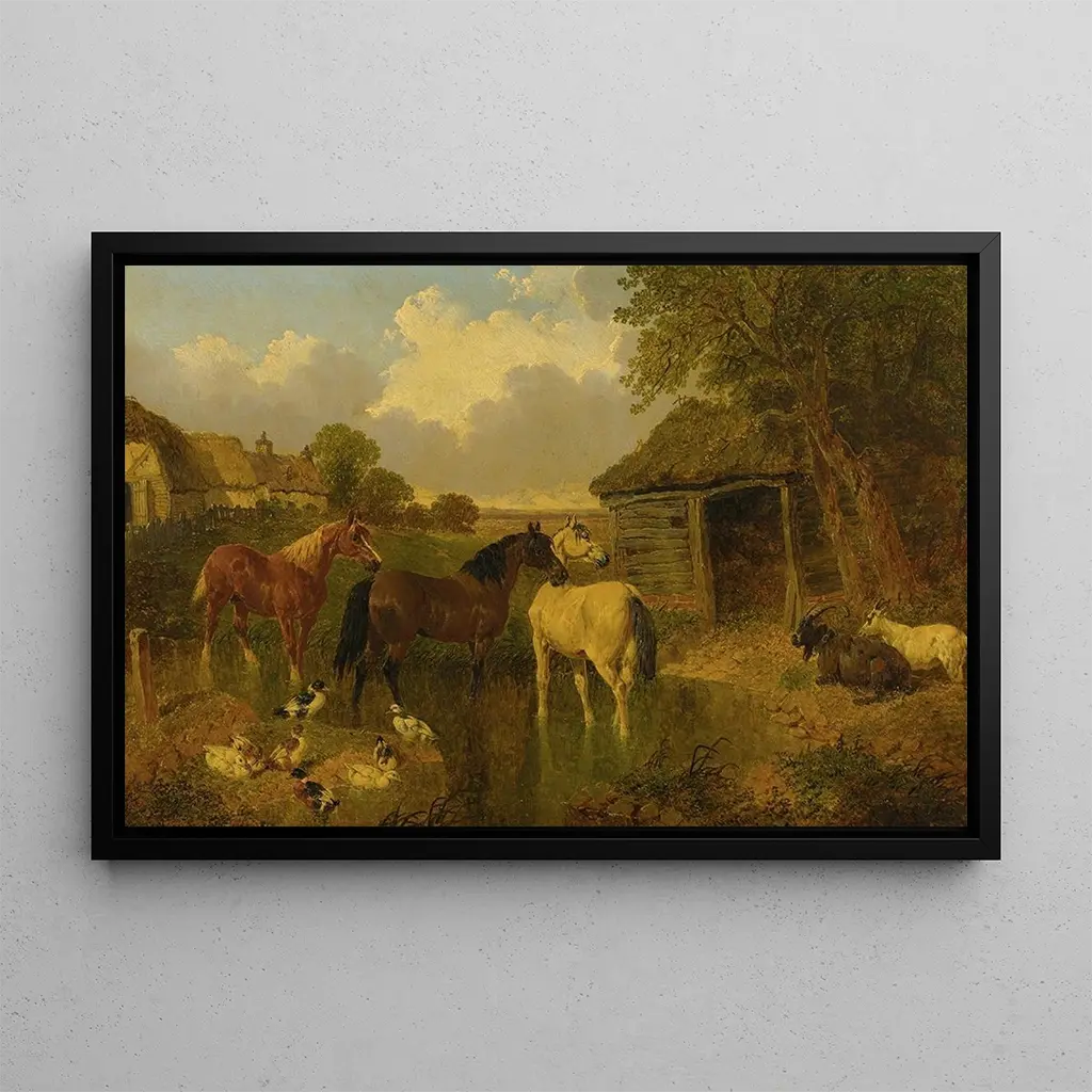 John Frederick Herring Jr., actif au XIXe siècle, est reconnu pour ses représentations réalistes de la vie rurale. Fils d'un peintre animalier, il a été influencé par les traditions artistiques de son époque, notamment le réalisme, qui cherchait à représenter la vie quotidienne avec précision. Ses œuvres, souvent centrées sur des scènes de la campagne anglaise, témoignent de son amour pour la nature et des animaux. Herring a su capturer l'essence de la vie agricole, faisant de lui une figure importante dans le paysage artistique britannique.