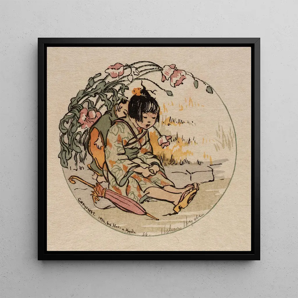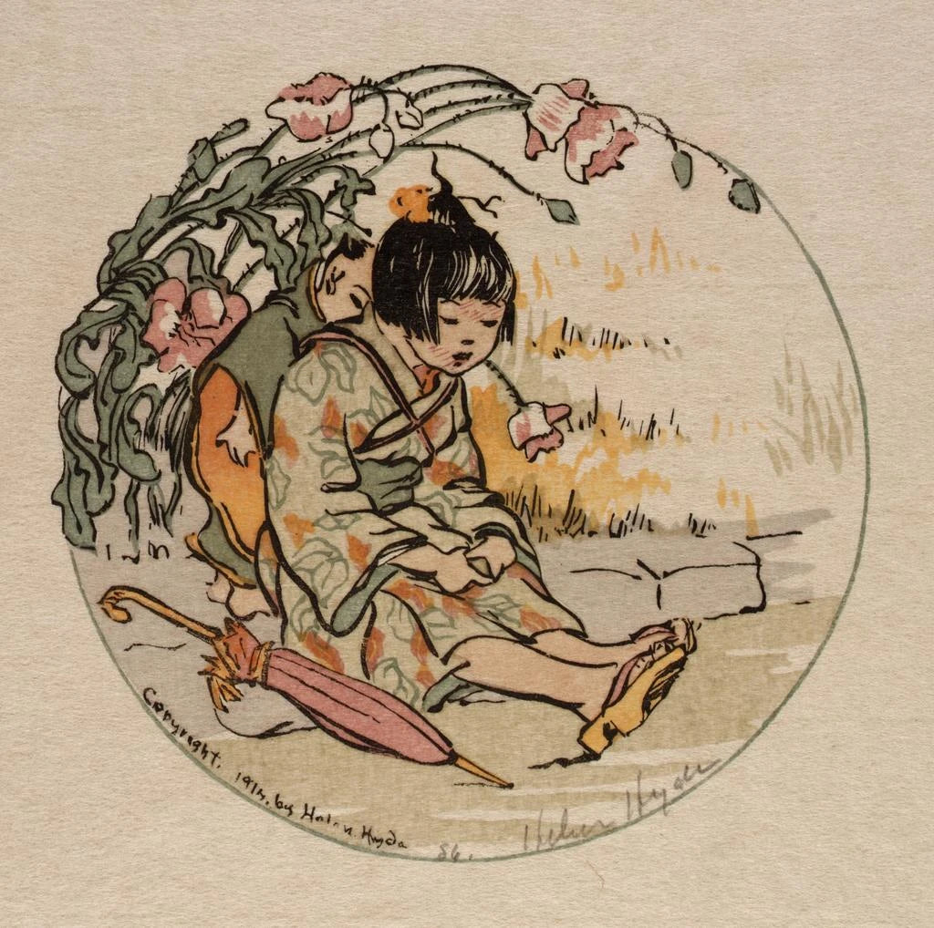 Helen Hyde (1868–1919) s'inscrit parmi les artistes américains séduits par le japonisme et la maîtrise des estampes en couleurs. Formée aux arts graphiques, elle a adopté des procédés proches de la gravure sur bois et des compositions influencées par l'ukiyo-e, valorisant contours nets et surfaces chromatiques harmonisées. Ses œuvres, centrées sur les scènes quotidiennes, les enfants et la vie familiale, ont contribué à populariser une sensibilité transatlantique mêlant précision descriptive et poésie silencieuse. Par son approche, Hyde a enrichi le répertoire décoratif occidental en offrant des images à la fois narratives et graphiquement raffinées.